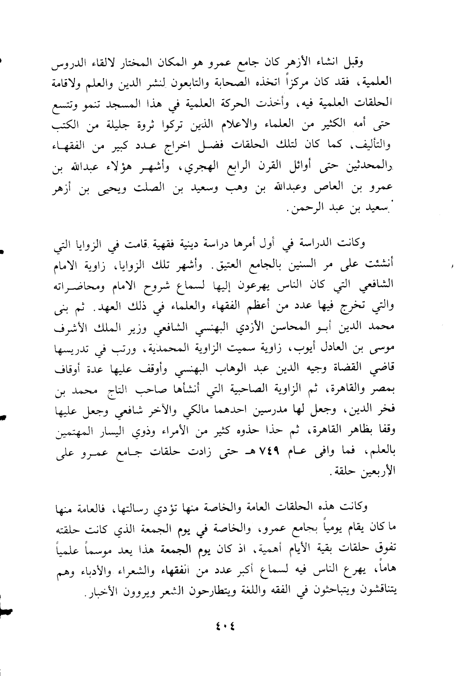 وقبل انشاء الأزهر كان جامع عمرو هو المكان المختار لالقاء الدروس العلمية، فقد كان مركزا اتخذه الصحابة والتابعون لنشر الدين والعلم ولاقامة الحلقات العلمية فيه، وأخذت الحركة العلمية في هذا المسجد تنمو وتتسع حتى أمه الكثير من العلماء والاعلام الذين تركوا ثروة جليلة من الكتب والتأليف، كما كان لتلك الحلقات فضل اخراج عدد كبير من الفقهاء والمحدثين حتى أوائل القرن الرابع الهجري، وأشهر هؤلاء عبد اللّه بن عمرو بن العاص وعبد اللّه بن وهب وسعيد بن الصلت ويحيى بن أزهر سعيد بن عبد الرحمن.