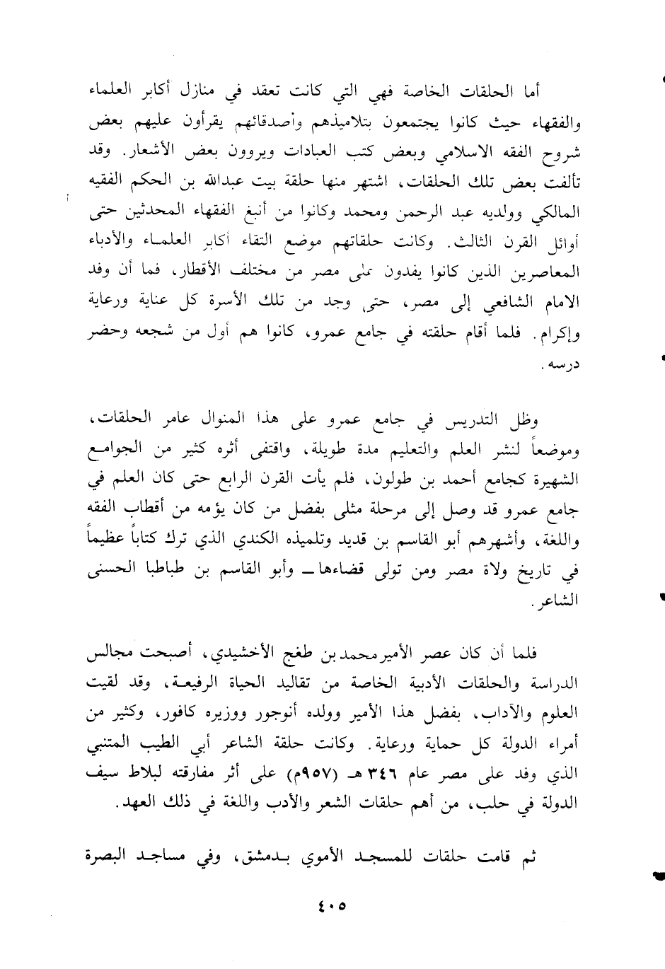 فلما أن كان عصر الأمير محمد بن طغج الأخشيدي، أصبحت مجالس الدراسة والحلقات الأدبية الخاصة من تقاليد الحياة الرفيعة، وقد لقيت العلوم والآداب، بفضل هذا الأمير وولده أنوجور ووزيره كافور، وكثير من أمراء الدولة كل حماية ورعاية. وكانت حلقة الشاعر أبي الطيب المتنبي الذي وفد على مصر عام 346 ه (957 م) على أثر مفارقته لبلاط سيف الدولة في حلب، من أهم حلقات الشعر والأدب واللغة في ذلك العهد.