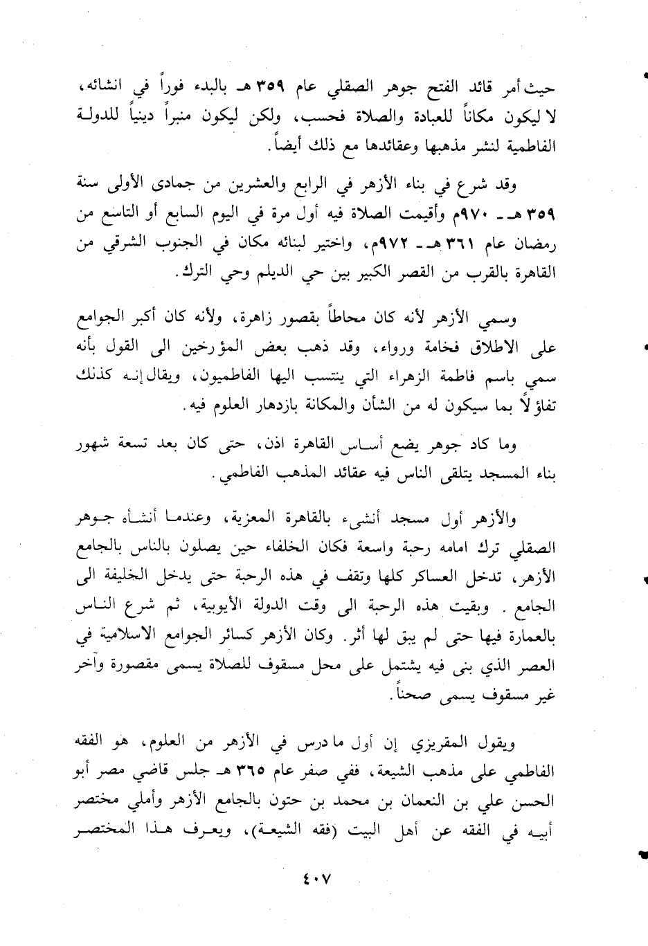 وما كاد جوهر يضع أساس القاهرة اذن، حتى كان بعد تسعة شهور بناء المسجد يتلقى الناس فيه عقائد المذهب الفاطمي.