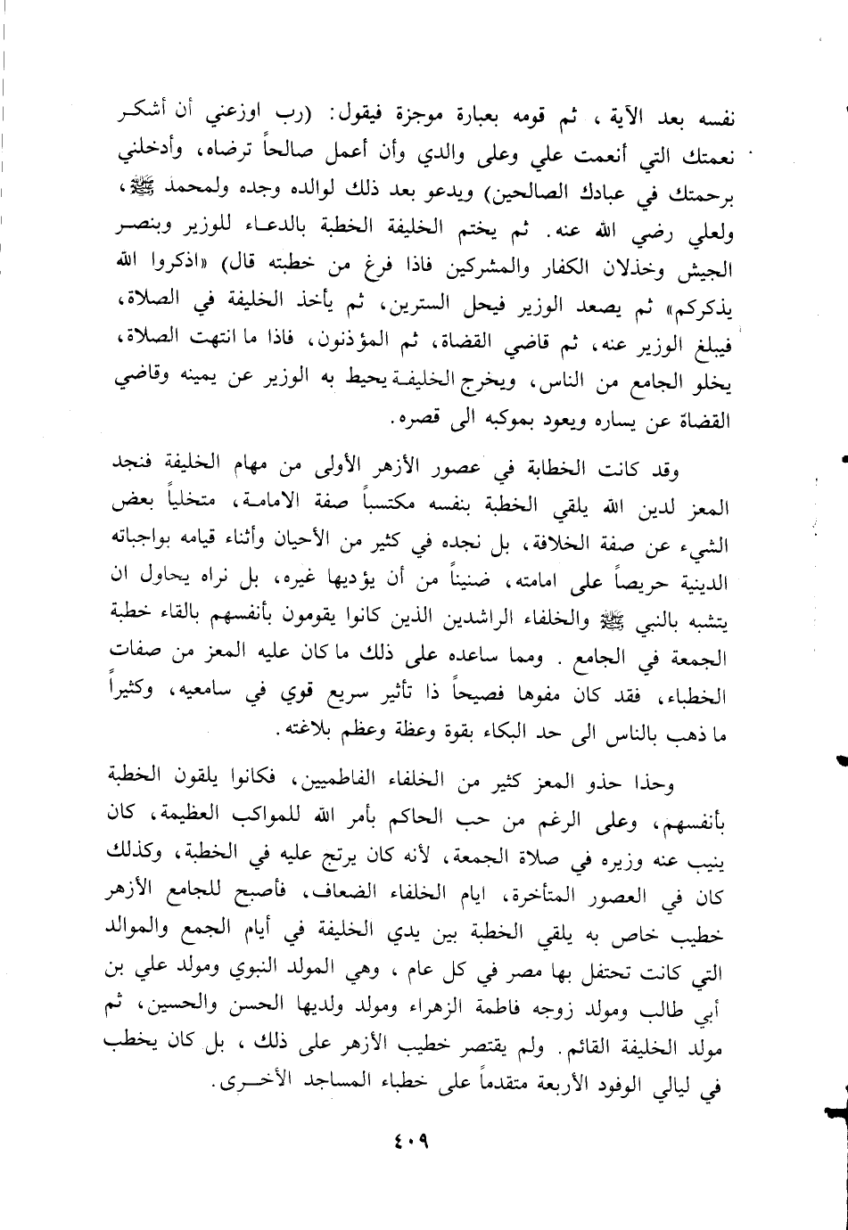 نفسه بعد الآية، ثم قومه بعبارة موجزة فيقول: (رب اوزعني أن أشكر نعمتك التي أنعمت علي وعلى والدي وأن أعمل صالحا ترضاه، وأدخلني برحمتك في عبادك الصالحين) ويدعو بعد ذلك لوالده وجده ولمحمد صلى اللّه عليه وسلم، ولعلي رضي اللّه عنه. ثم يختم الخليفة الخطبة بالدعاء للوزير وبنصر الجيش وخذلان الكفار والمشركين فاذا فرغ من خطبته قال) «اذكروا اللّه يذكركم» ثم يصعد الوزير فيحل السترين، ثم يأخذ الخليفة في الصلاة، فيبلغ الوزير عنه، ثم قاضي القضاة، ثم المؤذنون، فاذا ما انتهت الصلاة، يخلو الجامع من الناس، ويخرج الخليفة يحيط به الوزير عن يمينه وقاضي القضاة عن يساره ويعود بموكبه الى قصره.