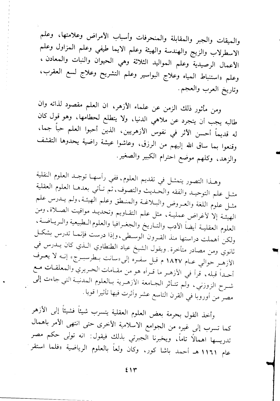 وهذا التصور يتمثل في تقديم العلوم، ففي رأسها توجد العلوم النقلية مثل علم التوحيد والفقه والحديث والتصوف، ثم تأتي بعدها العلوم العقلية مثل علوم اللغة والعروض والبلاغة والمنطق وعلم الهيئة، ولم يدرس علم الهيئة إلا لأغراض عملية، مثل علم التقاويم وتحديد مواقيت الصلاة، ومن العلوم العقلية أيضا الأدب والتاريخ والجغرافيا والعلوم الطبيعية والرياضة، ولكن أهملت دراستها منذ القرون الوسطى، وإذا درست فإنما تدرس في الأزهر حوالي عام 1827 م قبل سفره إلى «سانت بطرسبرج» إنه لا يعرف أحدا قبله، قرأ في الأزهر ما قرأه هو من مقامات الحريري والمعلقات مع شرح الزوزني، ولم تتأثر الجامعة الأزهرية بالعلوم المدنية التي جاءت إلى مصر من أوروبا في القرن التاسع عشر وأثرت فيها تأثيرا قويا.