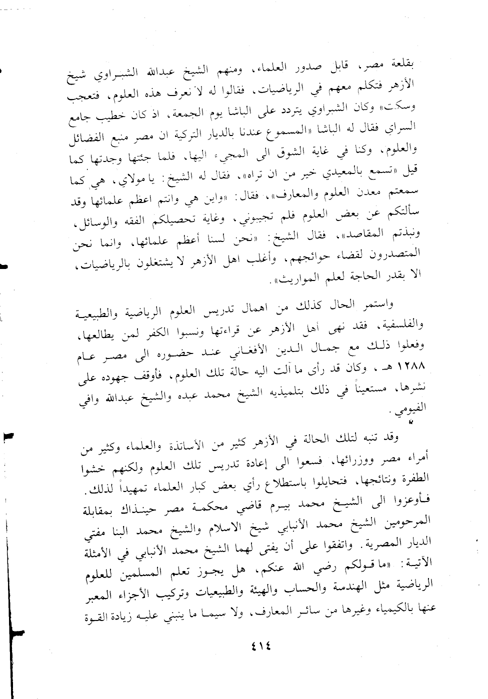 واستمر الحال كذلك من اهمال تدريس العلوم الرياضية والطبيعية والفلسفية، فقد نهى أهل الأزهر عن قراءتها ونسبوا الكفر لمن يطالعها، وفعلوا ذلك مع جمال الدين الأفغاني عند حضوره الى مصر عام 1288 ه، وكان قد رأى ما آلت اليه حالة تلك العلوم، فأوقف جهوده على نشرها، مستعينا في ذلك بتلميذيه الشيخ محمد عبده والشيخ عبد اللّه وافي الفيومي.