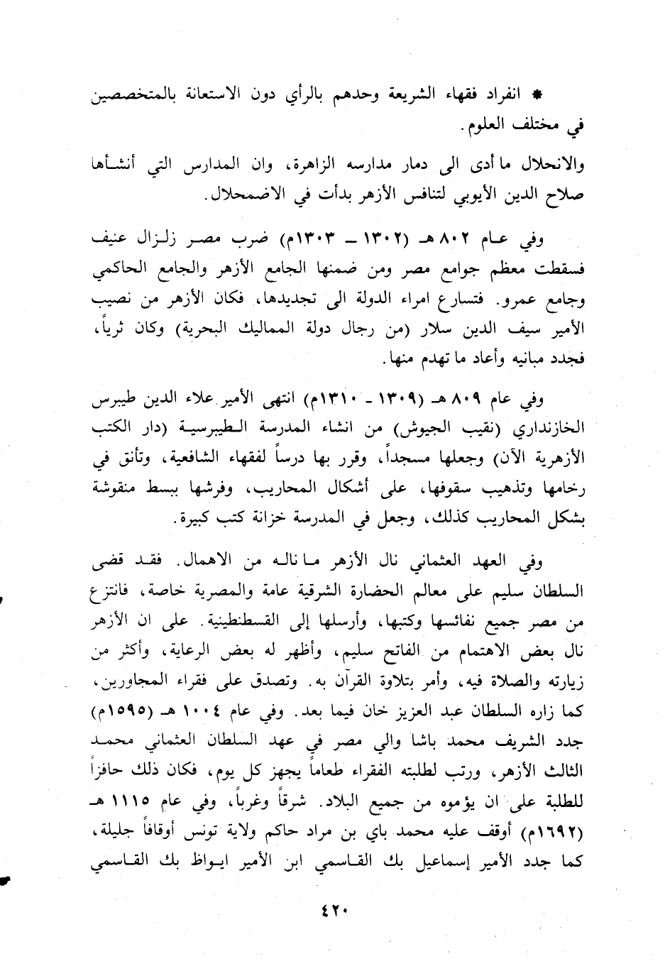 والانحلال ما أدى الى دمار مدارسه الزاهرة، وان المدارس التي أنشأها صلاح الدين الأيوبي لتنافس الأزهر بدأت في الاضمحلال.