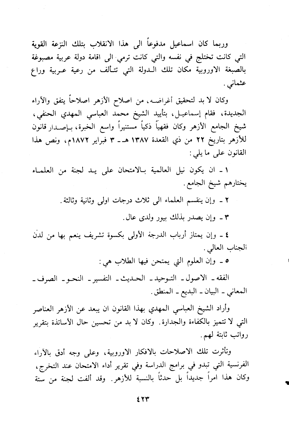 وكان لا بد لتحقيق أغراضه، من اصلاح الأزهر اصلاحا يتفق والآراء الجديدة، فقام إسماعيل، بتأييد الشيخ محمد العباسي المهدي الحنفي، شيخ الجامع الأزهر وكان فقهيا ذكيا مستنيرا واسع الخبرة، بإصدار قانون للأزهر بتاريخ 22 من ذي القعدة 1387 ه- 3 فبراير 1872 م، ونص هذا القانون على ما يلي: