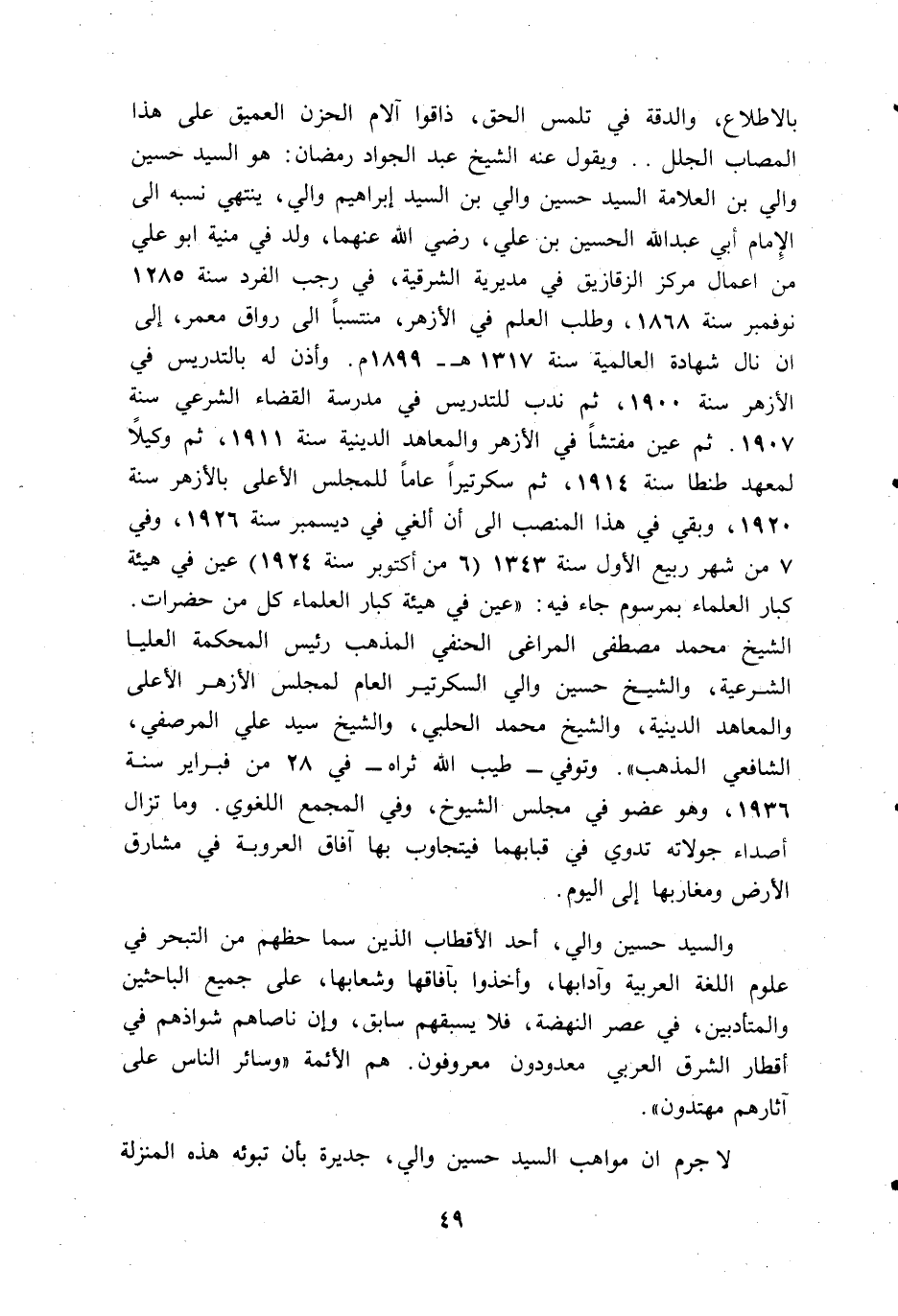 بالاطلاع، والدقة في تلمس الحق، ذاقوا آلام الحزن العميق على هذا المصاب الجلل. . ويقول عنه الشيخ عبد الجواد رمضان: هو السيد حسين والي بن العلامة السيد حسين والي بن السيد إبراهيم والي، ينتهي نسبه الى الإمام أبي عبد اللّه الحسين بن علي، رضي اللّه عنهما، ولد في منية ابو علي من اعمال مركز الزقازيق في مديرية الشرقية، في رجب الفرد سنة 1285 نوفمبر سنة 1868، وطلب العلم في الأزهر، منتسبا الى رواق معمر، إلى ان نال شهادة العالمية سنة 1317 ه- 1899 م. وأذن له بالتدريس في الأزهر سنة 1900، ثم ندب للتدريس في مدرسة القضاء الشرعي سنة 1907. ثم عين مفتشا في الأزهر والمعاهد الدينية سنة 1911، ثم وكيلا لمعهد طنطا سنة 1914، ثم سكرتيرا عاما للمجلس الأعلى بالأزهر سنة 1920، وبقي في هذا المنصب الى أن ألغي في ديسمبر سنة 1926، وفي 7 من شهر ربيع الأول سنة 1343 (6 من أكتوبر سنة 1924) عين في هيئة كبار العلماء بمرسوم جاء فيه: «عين في هيئة كبار العلماء كل من حضرات.