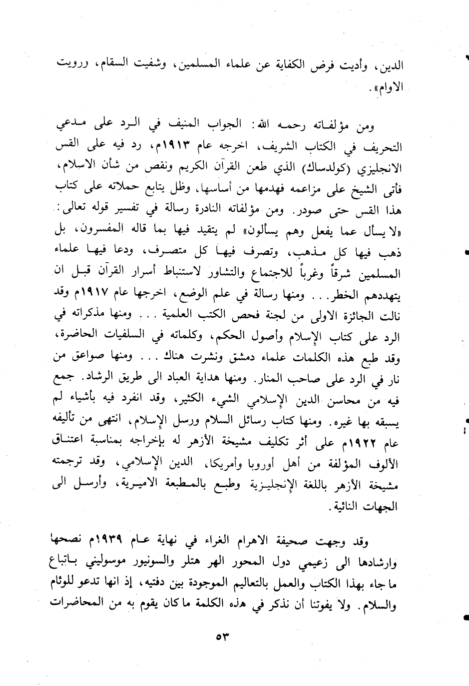 «لا يُسْئَلُ عَمّا يَفْعَلُ وَهُمْ يُسْئَلُونَ» لم يتقيد فيها بما قاله المفسرون، بل ذهب فيها كل مذهب، وتصرف فيها كل متصرف، ودعا فيها علماء المسلمين شرقا وغربا للاجتماع والتشاور لاستنباط أسرار القرآن قبل ان يتهددهم الخطر. . . ومنها رسالة في علم الوضع، اخرجها عام 1917 م وقد نالت الجائزة الاولى من لجنة فحص الكتب العلمية. . . ومنها مذكراته في الرد على كتاب الإسلام وأصول الحكم، وكلماته في السلفيات الحاضرة، وقد طبع هذه الكلمات علماء دمشق ونشرت هناك. . . ومنها صواعق من نار في الرد على صاحب المنار. ومنها هداية العباد الى طريق الرشاد. جمع فيه من محاسن الدين الإسلامي الشيء الكثير، وقد انفرد فيه بأشياء لم يسبقه بها غيره. ومنها كتاب رسائل السلام ورسل الإسلام، انتهى من تأليفه عام 1922 م على أثر تكليف مشيخة الأزهر له بإخراجه بمناسبة اعتناق الألوف المؤلفة من أهل أوروبا وأمريكا، الدين الإسلامي، وقد ترجمته مشيخة الأزهر باللغة الإنجليزية وطبع بالمطبعة الاميرية، وأرسل الى الجهات النائية.