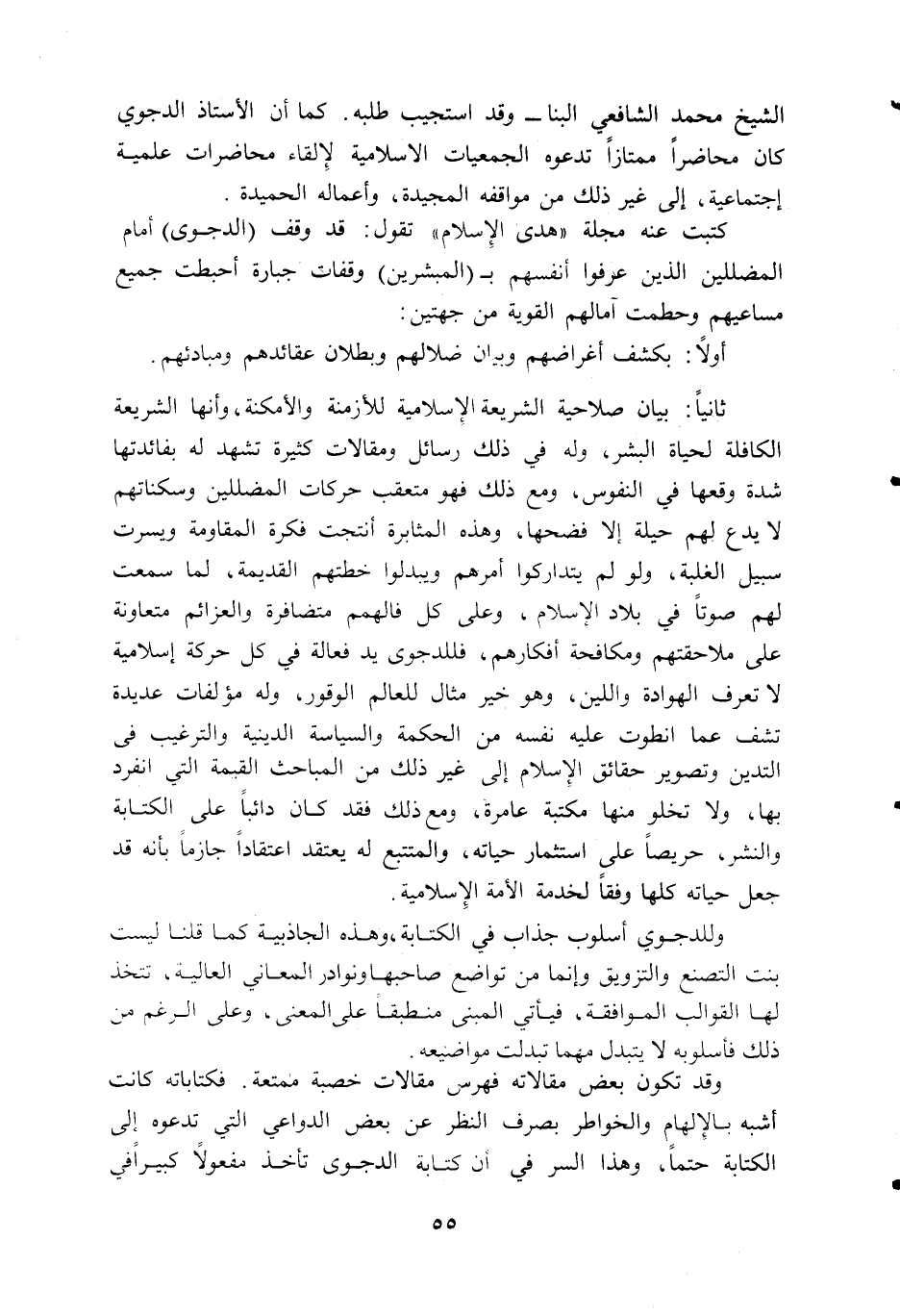 ثانيا: بيان صلاحية الشريعة الإسلامية للأزمنة والأمكنة، وأنها الشريعة الكافلة لحياة البشر، وله في ذلك رسائل ومقالات كثيرة تشهد له بفائدتها شدة وقعها في النفوس، ومع ذلك فهو متعقب حركات المضللين وسكناتهم لا يدع لهم حيلة إلا فضحها، وهذه المثابرة أنتجت فكرة المقاومة ويسرت سبيل الغلبة، ولو لم يتداركوا أمرهم ويبدلوا خطتهم القديمة، لما سمعت لهم صوتا في بلاد الإسلام، وعلى كل فالهمم متضافرة والعزائم متعاونة على ملاحقتهم ومكافحة أفكارهم، فللدجوى يد فعالة في كل حركة إسلامية لا تعرف الهوادة واللين، وهو خير مثال للعالم الوقور، وله مؤلفات عديدة تشف عما انطوت عليه نفسه من الحكمة والسياسة الدينية والترغيب فى التدين وتصوير حقائق الإسلام إلى غير ذلك من المباحث القيمة التي انفرد بها، ولا تخلو منها مكتبة عامرة، ومع ذلك فقد كان دائبا على الكتابة والنشر، حريصا على استثمار حياته، والمتتبع له يعتقد اعتقادا جازما بأنه قد جعل حياته كلها وفقا لخدمة الأمة الإسلامية.