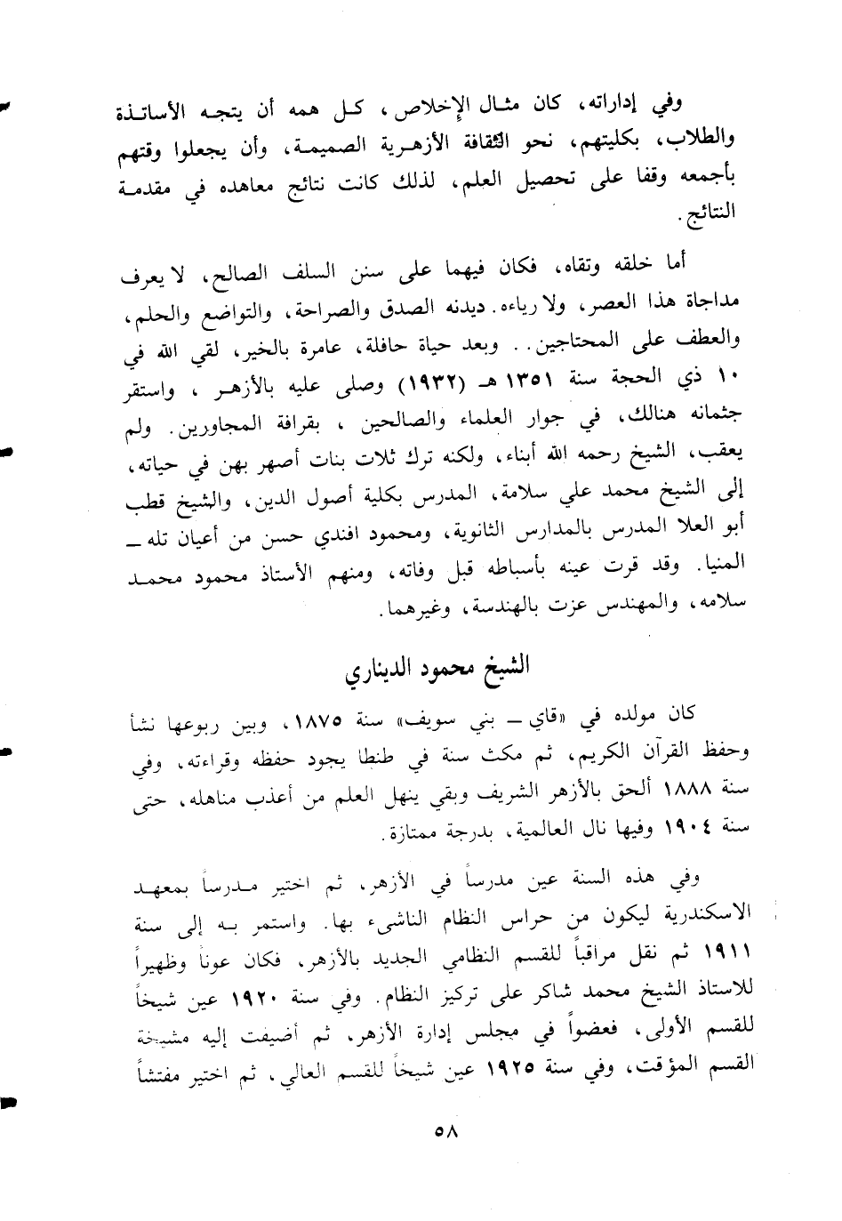 وفي إداراته، كان مثال الإخلاص، كل همه أن يتجه الأساتذة والطلاب، بكليتهم، نحو الثقافة الأزهرية الصميمة، وأن يجعلوا وقتهم بأجمعه وقفا على تحصيل العلم، لذلك كانت نتائج معاهده في مقدمة النتائج.