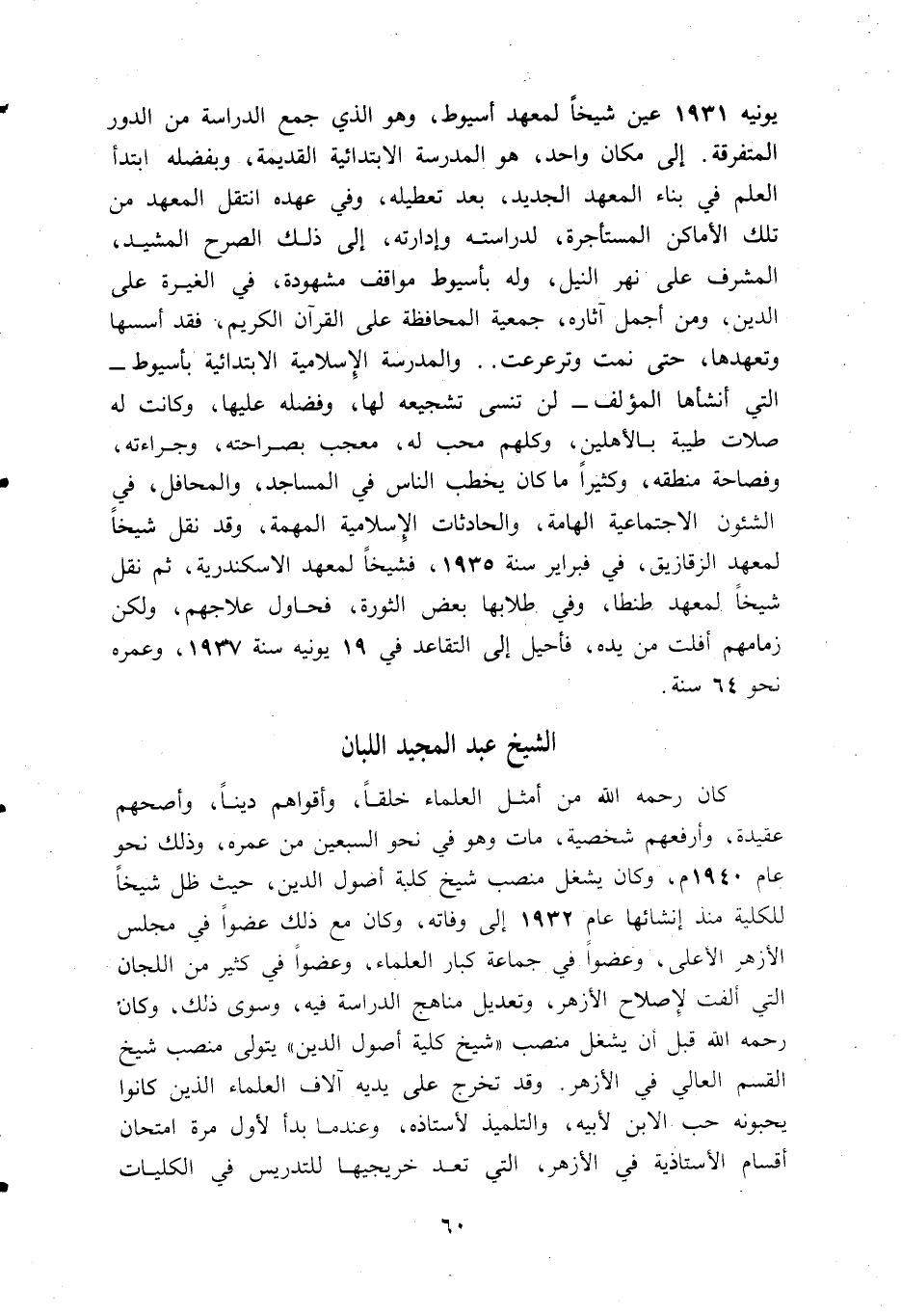 يونيه 1931 عين شيخا لمعهد أسيوط، وهو الذي جمع الدراسة من الدور المتفرقة. إلى مكان واحد، هو المدرسة الابتدائية القديمة، وبفضله ابتدأ العلم في بناء المعهد الجديد، بعد تعطيله، وفي عهده انتقل المعهد من تلك الأماكن المستأجرة، لدراسته وإدارته، إلى ذلك الصرح المشيد، المشرف على نهر النيل، وله بأسيوط مواقف مشهودة، في الغيرة على الدين، ومن أجمل آثاره، جمعية المحافظة على القرآن الكريم، فقد أسسها وتعهدها، حتى نمت وترعرعت. . والمدرسة الإسلامية الابتدائية بأسيوط- التي أنشأها المؤلف-لن تنسى تشجيعه لها، وفضله عليها، وكانت له صلات طيبة بالأهلين، وكلهم محب له، معجب بصراحته، وجراءته، وفصاحة منطقه، وكثيرا ما كان يخطب الناس في المساجد، والمحافل، في الشئون الاجتماعية الهامة، والحادثات الإسلامية المهمة، وقد نقل شيخا لمعهد الزقازيق، في فبراير سنة 1935، فشيخا لمعهد الاسكندرية، ثم نقل شيخا لمعهد طنطا، وفي طلابها بعض الثورة، فحاول علاجهم، ولكن زمامهم أفلت من يده، فأحيل إلى التقاعد في 19 يونيه سنة 1937، وعمره نحو 64 سنة.