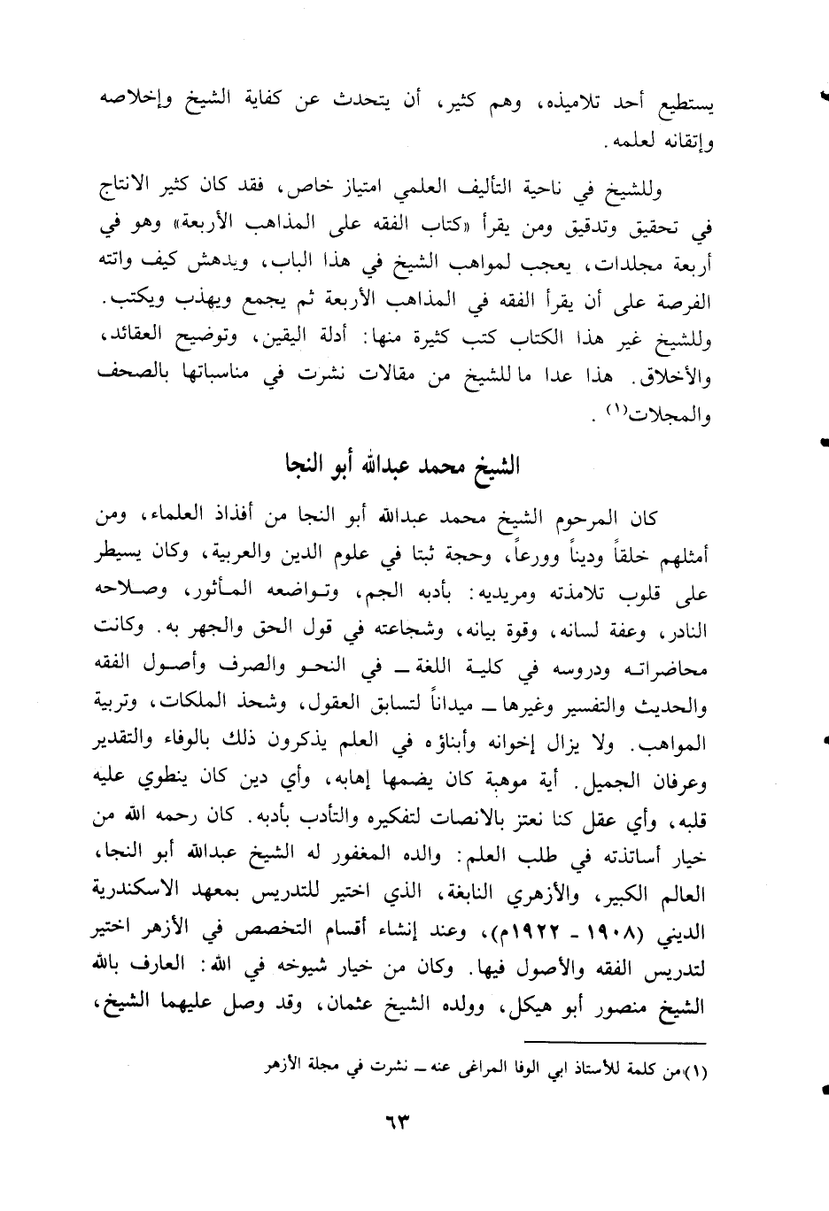 كان المرحوم الشيخ محمد عبد اللّه أبو النجا من أفذاذ العلماء، ومن أمثلهم خلقا ودينا وورعا، وحجة ثبتا في علوم الدين والعربية، وكان يسيطر على قلوب تلامذته ومريديه: بأدبه الجم، وتواضعه المأثور، وصلاحه النادر، وعفة لسانه، وقوة بيانه، وشجاعته في قول الحق والجهر به. وكانت محاضراته ودروسه في كلية اللغة-في النحو والصرف وأصول الفقه والحديث والتفسير وغيرها-ميدانا لتسابق العقول، وشحذ الملكات، وتربية المواهب. ولا يزال إخوانه وأبناؤه في العلم يذكرون ذلك بالوفاء والتقدير وعرفان الجميل. أية موهبة كان يضمها إهابه، وأي دين كان ينطوي عليه قلبه، وأي عقل كنا نعتز بالانصات لتفكيره والتأدب بأدبه. كان رحمه اللّه من خيار أساتذته في طلب العلم: والده المغفور له الشيخ عبد اللّه أبو النجا، العالم الكبير، والأزهري النابغة، الذي اختير للتدريس بمعهد الاسكندرية الديني (1908 - 1922 م)، وعند إنشاء أقسام التخصص في الأزهر اختير لتدريس الفقه والأصول فيها. وكان من خيار شيوخه في اللّه: العارف باللّه الشيخ منصور أبو هيكل، وولده الشيخ عثمان، وقد وصل عليهما الشيخ،