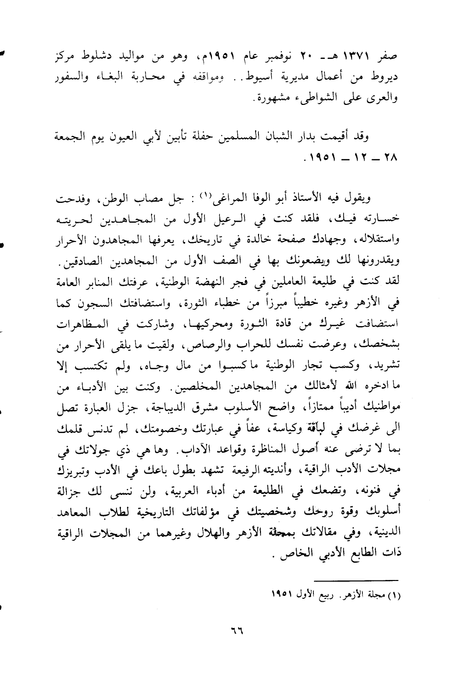 لقد كنت في طليعة العاملين في فجر النهضة الوطنية، عرفتك المنابر العامة في الأزهر وغيره خطيبا مبرزا من خطباء الثورة، واستضافتك السجون كما استضافت غيرك من قادة الثورة ومحركيها، وشاركت في المظاهرات بشخصك، وعرضت نفسك للحراب والرصاص، ولقيت ما يلقى الأحرار من تشريد، وكسب تجار الوطنية ما كسبوا من مال وجاه، ولم تكتسب إلا ما ادخره اللّه لأمثالك من المجاهدين المخلصين. وكنت بين الأدباء من مواطنيك أديبا ممتازا، واضح الأسلوب مشرق الديباجة، جزل العبارة تصل الى غرضك في لباقة وكياسة، عفا في عبارتك وخصومتك، لم تدنس قلمك بما لا ترضى عنه أصول المناظرة وقواعد الآداب. وها هي ذي جولاتك في مجلات الأدب الراقية، وأنديته الرفيعة تشهد بطول باعك في الأدب وتبريزك في فنونه، وتضعك في الطليعة من أدباء العربية، ولن ننسى لك جزالة أسلوبك وقوة روحك وشخصيتك في مؤلفاتك التاريخية لطلاب المعاهد الدينية، وفي مقالاتك بمحلة الأزهر والهلال وغيرهما من المجلات الراقية ذات الطابع الأدبي الخاص.