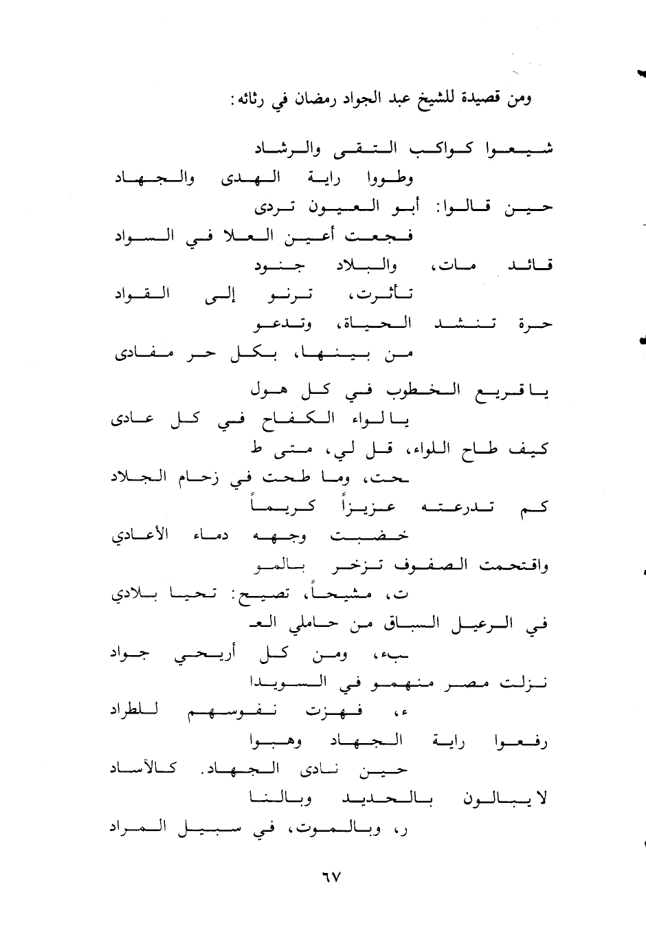 ومن قصيدة للشيخ عبد الجواد رمضان في رثائه: