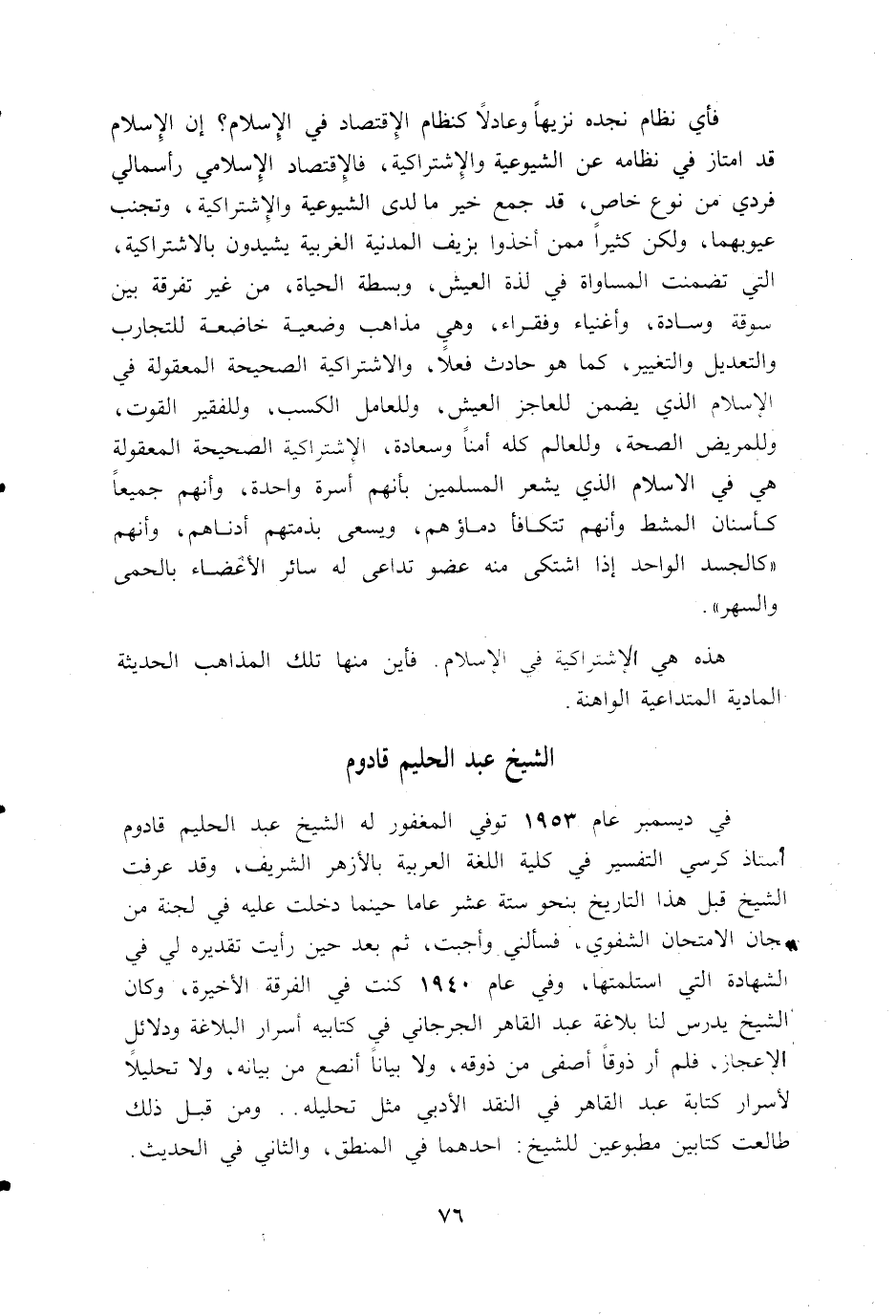 فأي نظام نجده نزيها وعادلا كنظام الإقتصاد في الإسلام؟ إن الإسلام قد امتاز في نظامه عن الشيوعية والإشتراكية، فالإقتصاد الإسلامي رأسمالي فردي من نوع خاص، قد جمع خير ما لدى الشيوعية والإشتراكية، وتجنب عيوبهما، ولكن كثيرا ممن أخذوا بزيف المدنية الغربية يشيدون بالاشتراكية، التي تضمنت المساواة في لذة العيش، وبسطة الحياة، من غير تفرقة بين سوقة وسادة، وأغنياء وفقراء، وهي مذاهب وضعية خاضعة للتجارب والتعديل والتغيير، كما هو حادث فعلا، والاشتراكية الصحيحة المعقولة في الإسلام الذي يضمن للعاجز العيش، وللعامل الكسب، وللفقير القوت، وللمريض الصحة، وللعالم كله أمنا وسعادة، الإشتراكية الصحيحة المعقولة هي في الإسلام الذي يشعر المسلمين بأنهم أسرة واحدة، وأنهم جميعا كأسنان المشط وأنهم تتكافا دماؤهم، ويسعى بذمتهم أدناهم، وأنهم «كالجسد الواحد إذا اشتكى منه عضو تداعى له سائر الأعضاء بالحمى والسهر».