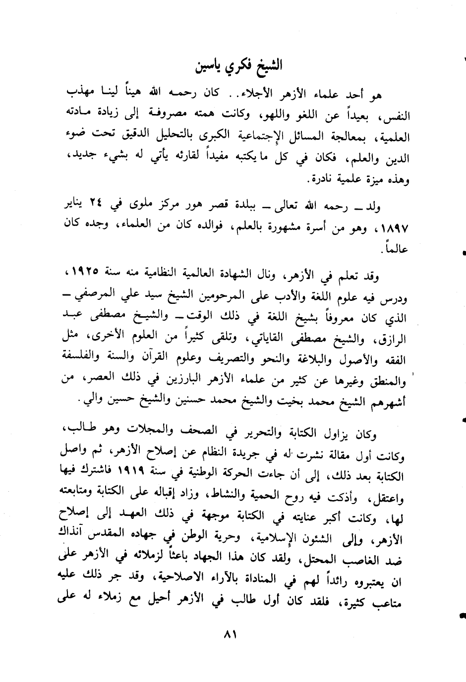 هو أحد علماء الأزهر الأجلاء. . كان رحمه اللّه هينا لينا مهذب النفس، بعيدا عن اللغو واللهو، وكانت همته مصروفة إلى زيادة مادته العلمية، بمعالجة المسائل الإجتماعية الكبرى بالتحليل الدقيق تحت ضوء الدين والعلم، فكان في كل ما يكتبه مفيدا لقارئه يأتي له بشيء جديد، وهذه ميزة علمية نادرة.