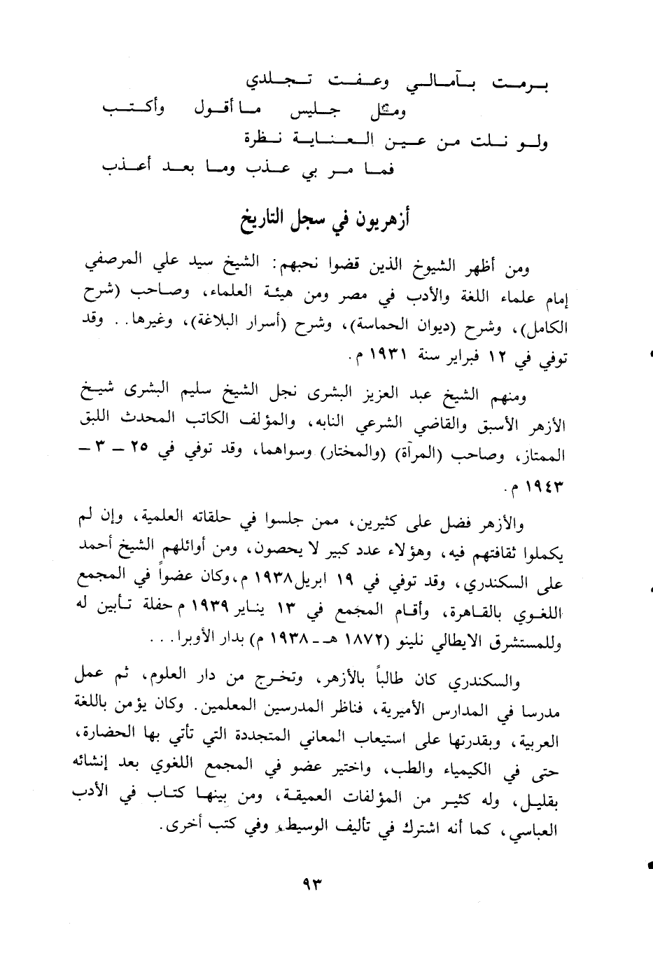 ومن أظهر الشيوخ الذين قضوا نحبهم: الشيخ سيد علي المرصفي إمام علماء اللغة والأدب في مصر ومن هيئة العلماء، وصاحب (شرح الكامل)، وشرح (ديوان الحماسة)، وشرح (أسرار البلاغة)، وغيرها. . وقد توفي في 12 فبراير سنة 1931 م.