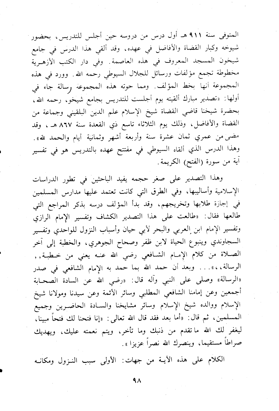 وهذا الدرس الذي ألقاه السيوطي في مفتتح عهده بالتدريس هو في تفسير آية من سورة (الفتح) الكريمة.
