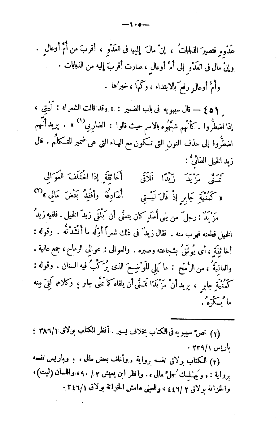 قال سيبويه في باب الضمير: (وقد قالت الشعراء (ليتي) إذا اضطروا، كأنهم شبهوه بالاسم حيث قالوا: الضاربي). يريد أنهم اضطروا إلى حذف النون التي تكون مع الياء التي هي ضمير المتكلم. قال زيد الخيل الطائي: