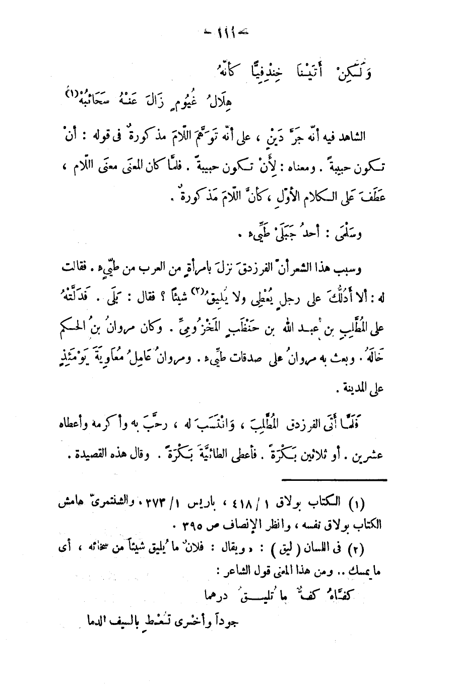 فلما أتى الفرزدق المطلبَْ وانتسب له، رحب بهْ وأكرمه، وأعطاه عشرين أو ثلاثين بَكرة، فأعطى الطائية بكرة. وقال هذه القصيدة.
