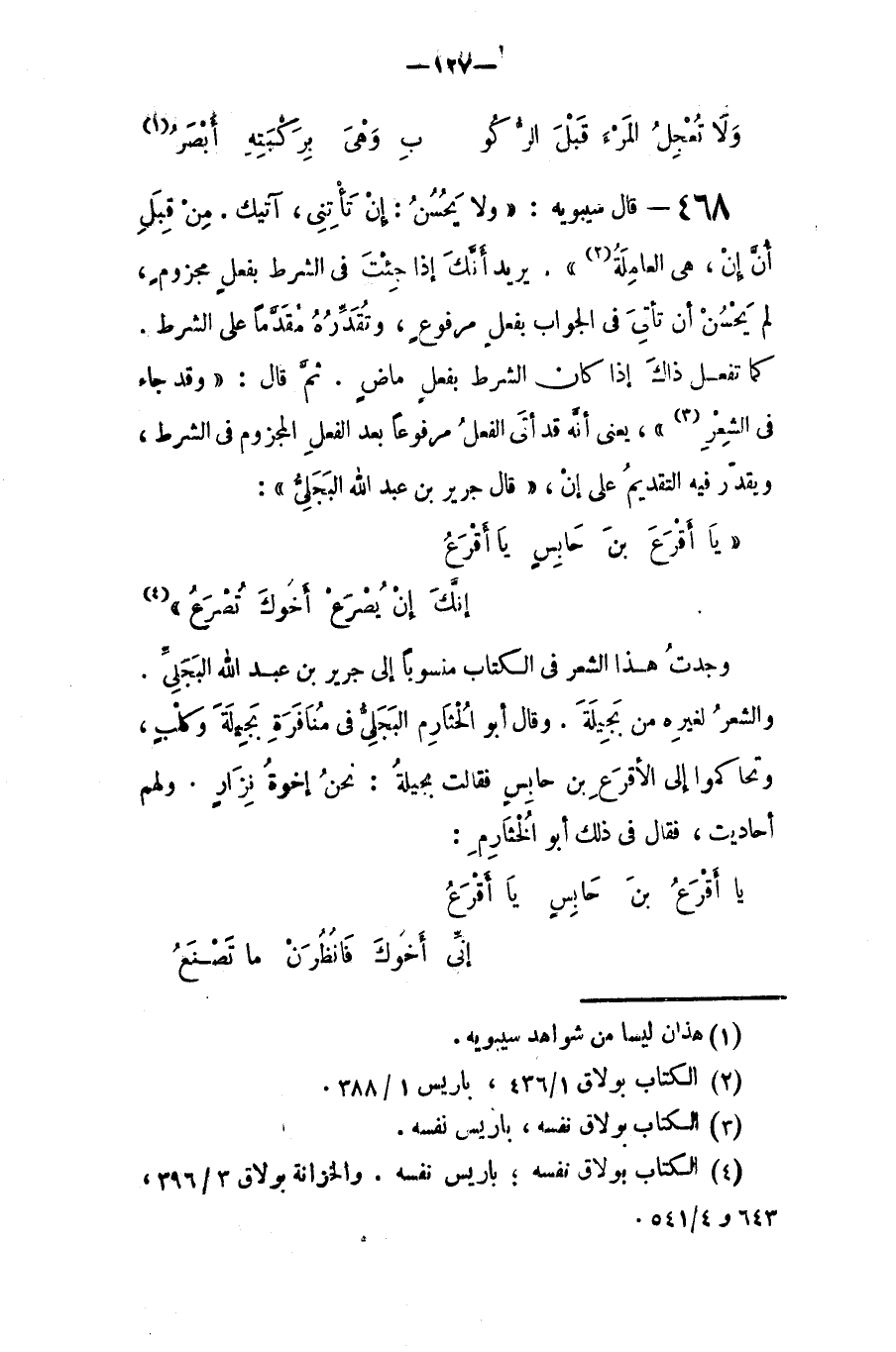 يريد أنك إذا جئت في الشرط بفعل مجزوم، لم يحسن أن تأتي في الجواب بفعل مرفوعْ وتقدره مقدماً على الشرط، كما يُفعل ذلك إذا كان الشرط بفعل ماض. ثم قال: (وقد جاء في الشعر) يعني أنه قد أتى الفعل مرفوعاً بعد الفعل المجزوم في الشرط، ويقدَر فيه التقديم على (إنْ) (قال جرير بن عبد الله البَجَلي).