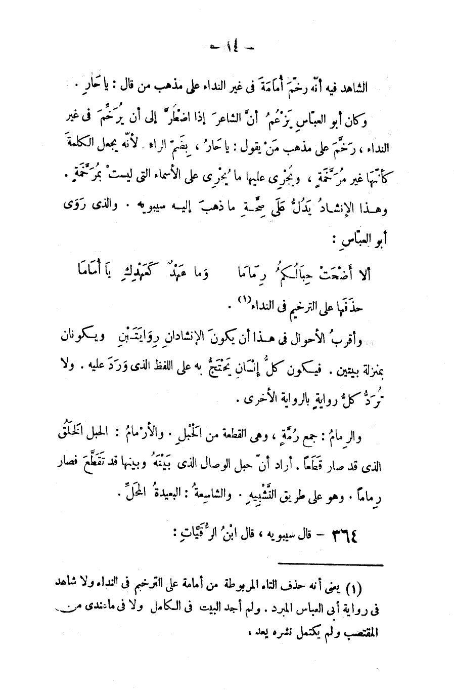 الشاهد فيه إنه رخم إمامة في غير النداء على مذهب من قال: يا حار وكان أبو العباس يزعم أن الشاعر إذا اضطر إلى أن يرخم في غير النداء؛ رخم على مذهب من يقول: يا حار بضم الراء، لأنه يجعل الكلمة كأنها غير مرخمة، ويجري عليها ما يجري على الأسماء التي ليست بمرخمة. وهذا الإنشاد يدل على صحة ما ذهب إليه سيبويه.