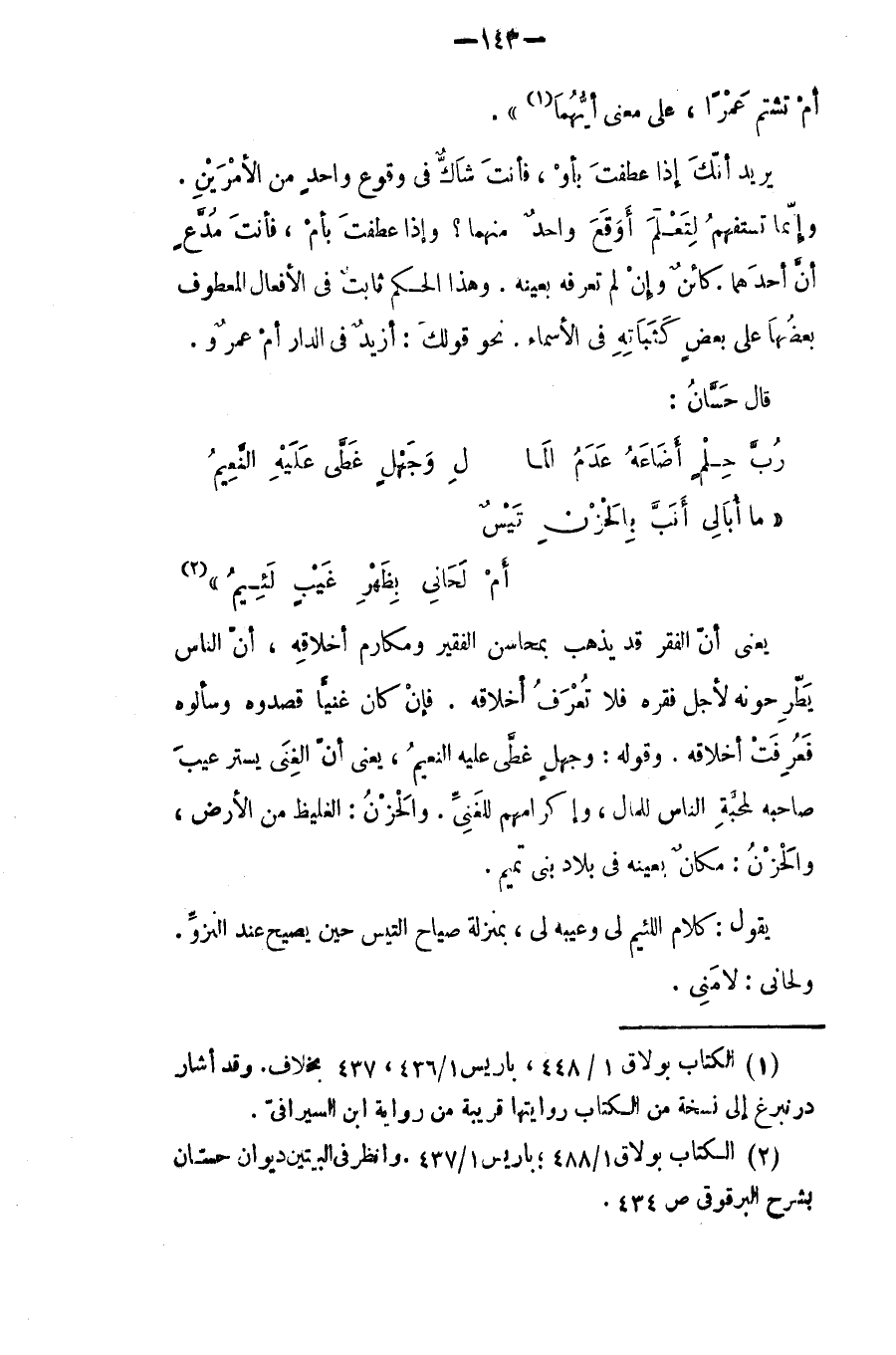وقوله: (وجهلٍ غطا عليه النعيم) يعني أن الغنَى يسترعيب صاحبه لمحبة الناس للمالْ وإكرامهم للغني. والحزن: الغليظ من الأرض، والحَزن مكان بعينه في بلاد بني تميم. يقول: كلام اللئيم لي وعيبه لي، بمنزلة صياح التيس حين يصيح عند النزو. ولحاني: لامني.
