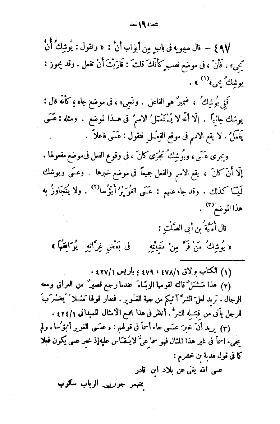 قال سيبويه في باب من أبواب (أنْ) (وتقول يوشك أن يجيءَ، فـ (أنْ) في موضع نصب كأنك قلت: قاربتَ أنْ تفعل. وقد يجوز: يوشك يجيءُ).