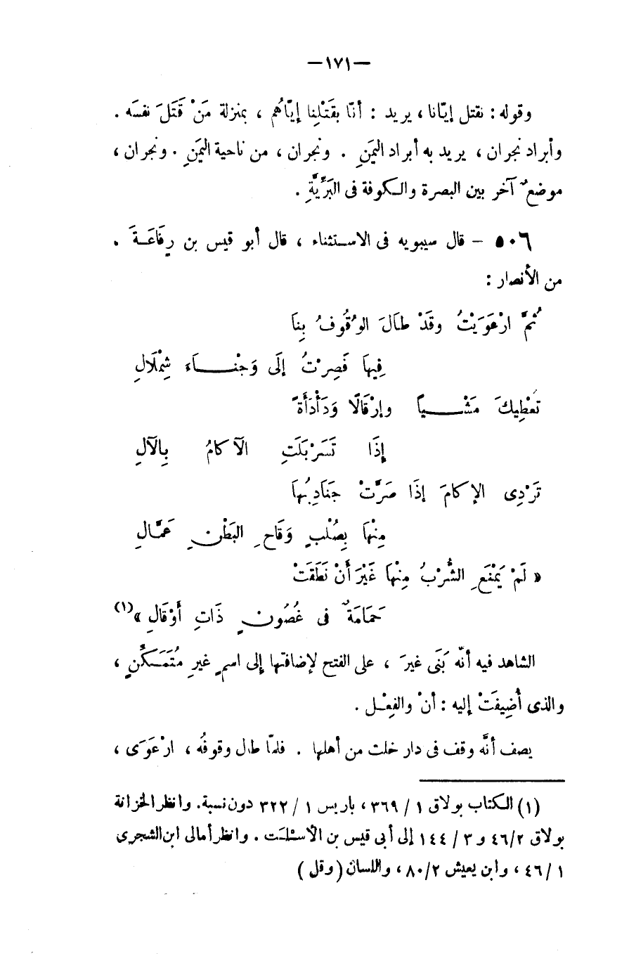 قال سيبويه في الاستثناء، قال أبو قيس بن رِفاعة من الأنصار: