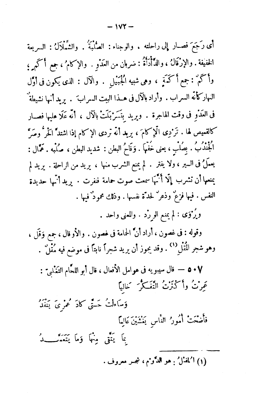 يريد أنها نشيطة في العدو في وقت الهاجرة. ويريد بـ (تسربلتِ بالآل) أنه علا عليها فصار كالقميص لها. تَردي الإكامَ: يريد أنه ترمي الإكامَ إذا اشتد الحرْ وصَرَّ الجندب بصُلب، يعني خفها، وَقاحِ البطن: شديد البطن صلبه، عَمّال: يعمل في السيرْ ولا يفتر.