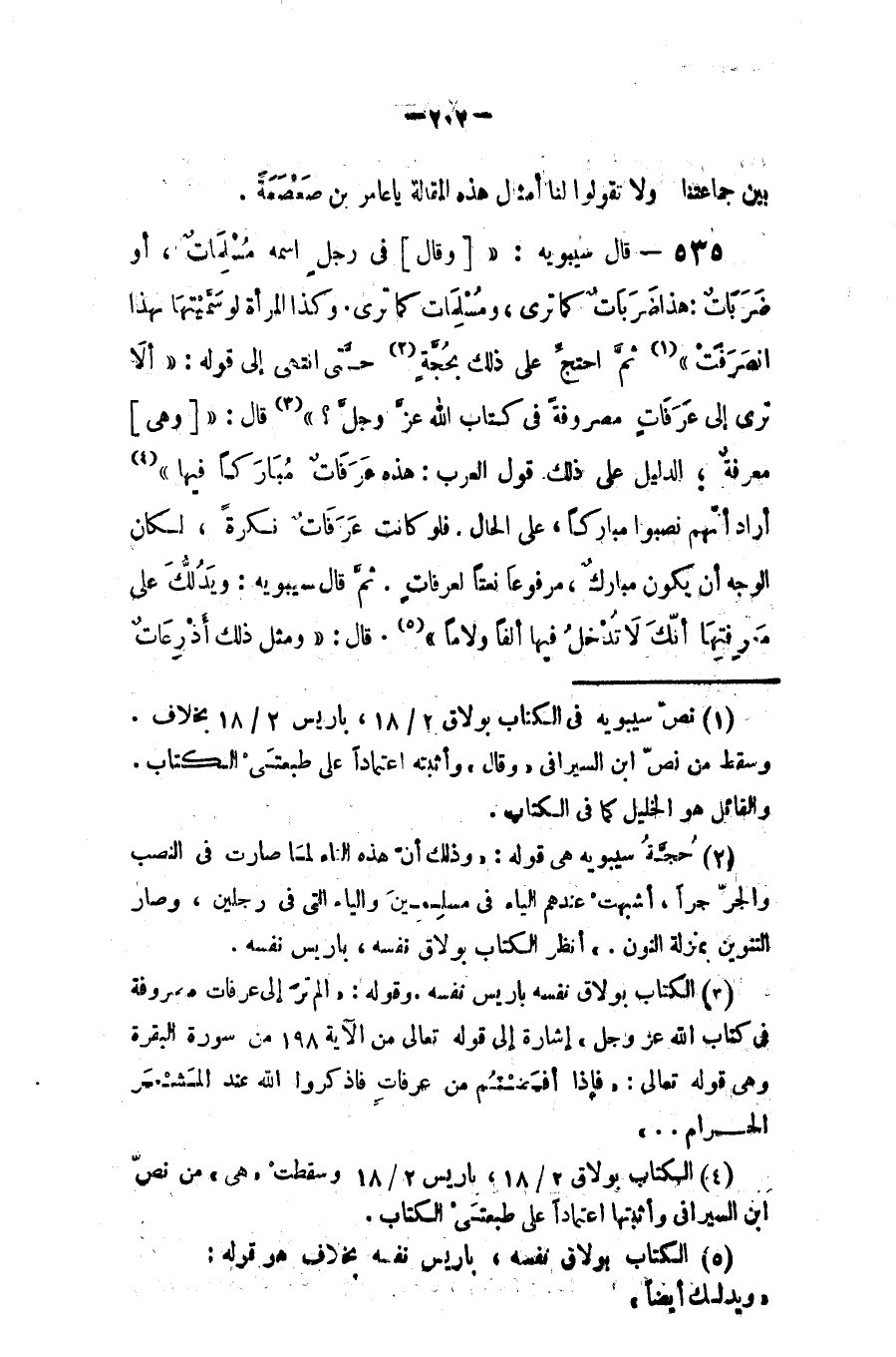 ومسلماتُ كما ترى، وكذا المرأة لو سميتها بهذا انصرفت). ثم احتج على ذلك بحجة حتى انتهى إلى قوله: (ألا ترى إلى (عرفات) مصروفة في كتاب الله عز وجل، وهي معرفة، الدليل على ذلك قول العرب: هذه عرفاتُ مباركاً فيها).