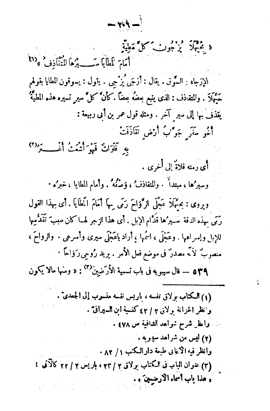 الإزجاء: السَّوْق يقال: أزجى يُزجي. يقول: يسوقون المطايا بقولهم (حيّهلا) والمُتقاذِفُ: الذي يتبع بعضه بعضاً، كأنّ كل سير تسيره هذه المطية يقذف بها إلى سير آخر. ومثله قول عمر بن أبي ربيعة:
