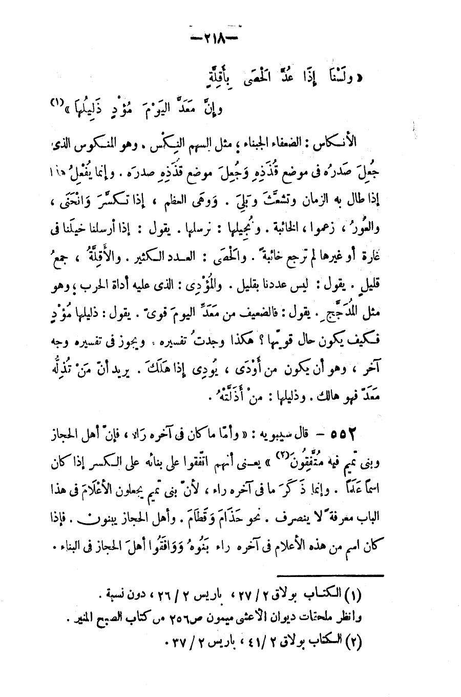 الأنكاس: الضعفاء الجبناء، مثل السهم النِكس وهو المنكوس الذي جُعل صدره في موضع فذ َذه وجُعل موضع فذ َذه صدره. وإنما يُفعل هذا إذا طال به الزمان وتشعّث وبلي، ووَهَى العظم: إذا تكسّر وانحنى، والعور: زعموا الخائبة، ونجيلها: نرسلها.