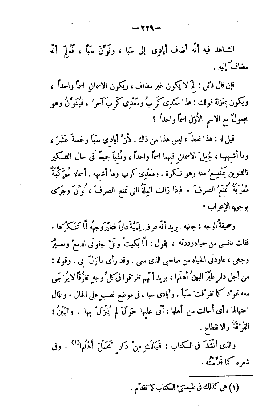 وقوله: (مِنْ أجلِ دارٍ طيرَ البينُ أهلها) يريد أنهم تفرقوا في كل وجه، تفرقاً لا يرجى معه عَوْد، كما تفرقت سبأ، و (أيادي سبا) في موضع نصب على الحال. وطال احتيالها: أي أحالت من أهلها، أتى عليها حول لم يُنزل بها. والبين: الفرقة والانقطاع. والذي أنشد في الكتاب: