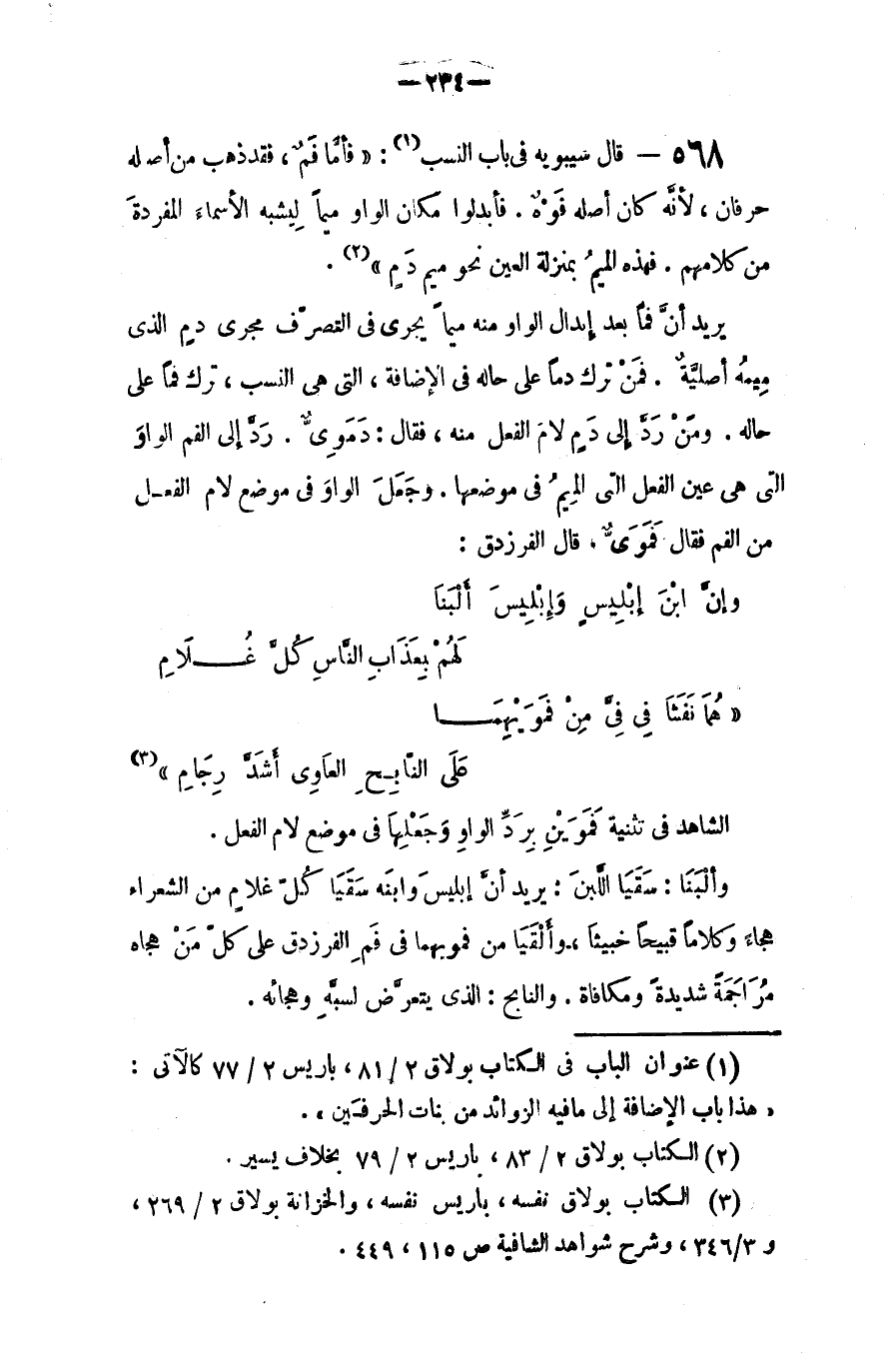 يريد أنّ (فماً) بعد إبدال الواو منه ميماً، يجري في التصرف مجرى (دم) الذي ميمه أصلية، فمن ترك (دماً) على حاله في الإضافة التي هي النسب، ترك (فماً) على حاله، ومن رد إلى (دم) لام الفعل منه فقال: (دموي) رد إلى (فم) الواوالتي هي عين الفعل التي الميم في موضعها، وجعل الواو في موضع لام الفعل من الفم فقال (فموي). قال الفرزدق: