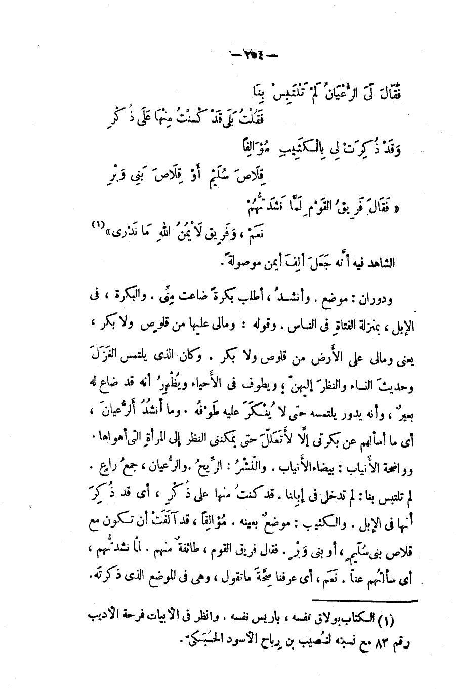والكثيب: موضع بعينه، مؤالفاً: قد آلفت أن تكون مع قلاص بن سليم أوبني وَبر. فقال فريق القوم: طائفة منهم، لما نشدتهم: أي سألتهم عنها. نعم: أي قد عرفنا صحة ما تقول، وهي في الموضع الذي ذكرته،