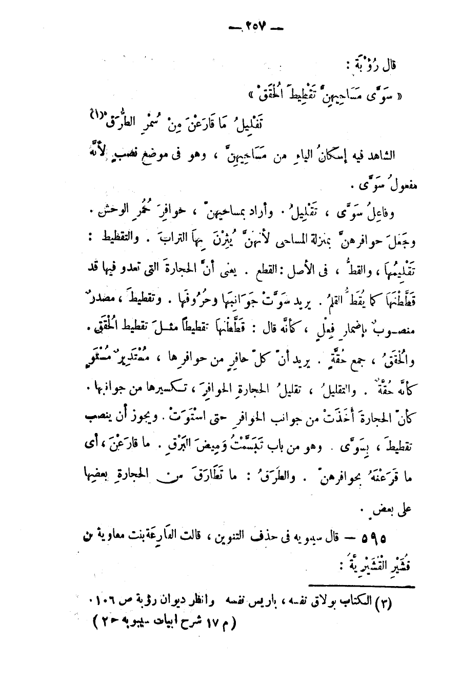 ويجوز أن تنصب (تقطيط) بسوّى. وهو من باب: تبسمتْ وميضَ البرق. ما قرعن: أي ما قارعنه بحوافرهن. والطرَق: ما تطارق من الحجارة بعضها على بعض.