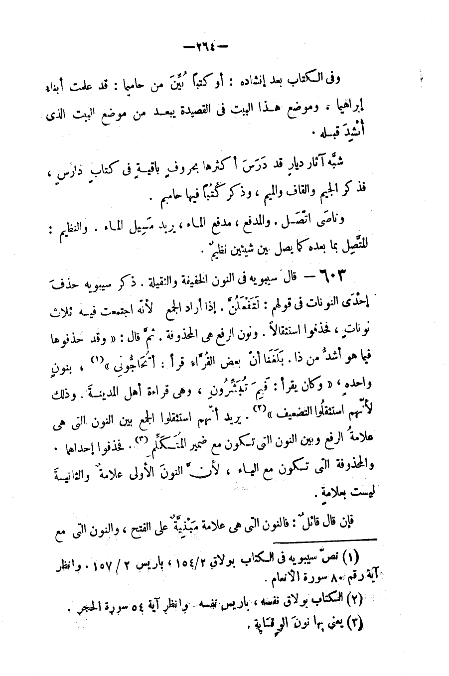 قال سيبويه في النون الخفيفة والثقيلة، ذكر سيبويه حذف إحدى النونات في قولهم (لتفعلنّ) إذا أراد الجمع، لأنه اجتمعت فيه ثلاث نونات، فحذفوا استثقالاً، ونون