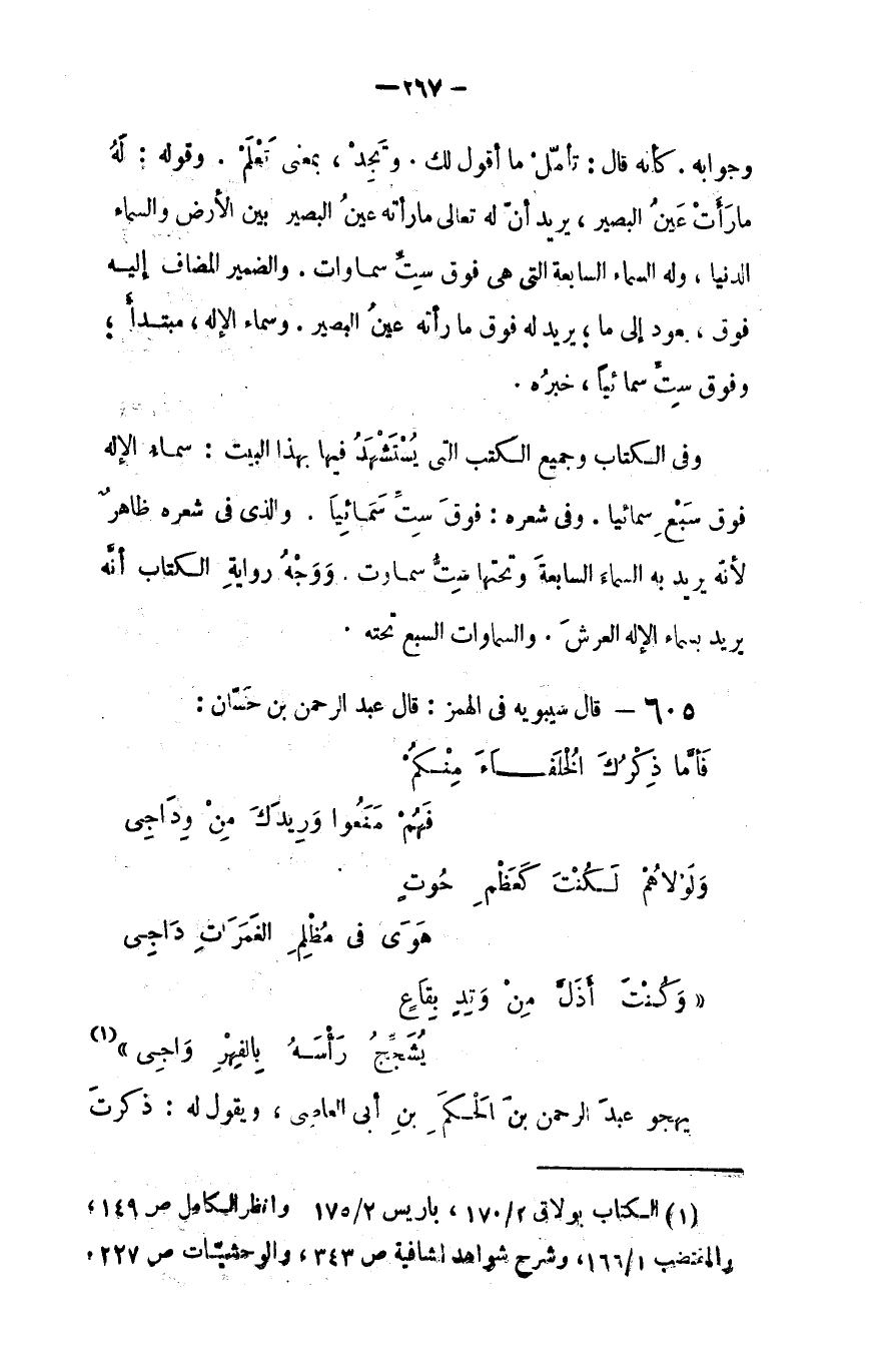 وفي شعره: فوق سِتِّ سمائيا. والذي في شعره ظاهر، لأنه يريد به: السماء السابعة، وتحتها ست سماوات. ووجه رواية الكتاب، أنه يريد بسماء الإله: العرش، والسماوات السبع تحته.