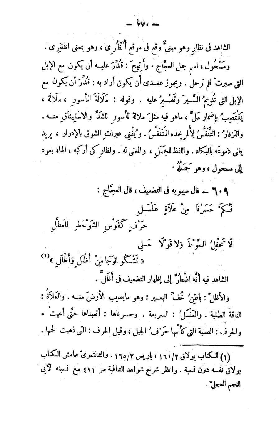 الشاهد في (نظارِ) وهومبني، ووقع في موقع: انظري، وهو بمعنى (انتظري) ومسحول: اسم جمل العجاج. وأتيح: قدِّر عليه أن يكون مع الإبل التي صبرت فلم