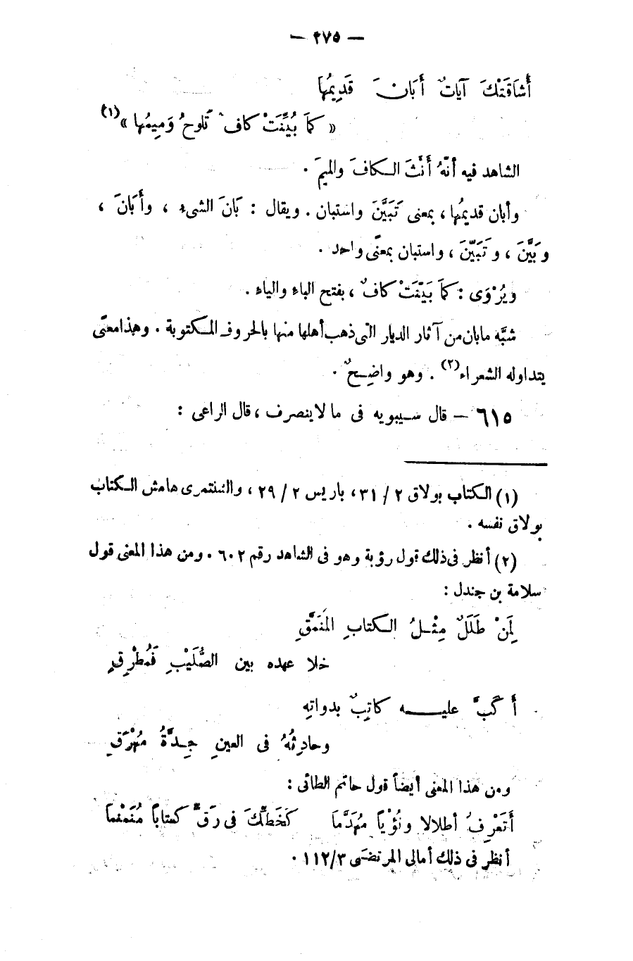 وأبانَ قديمُها: بمعنى تبيّن واستبان، ويقال بان الشيءُ وأبان وبيّن وتبيّن واستبان بمعنى واحد. ويروى: (كما تبيَّنتْ كافُ) بفتح الباء والياء.
