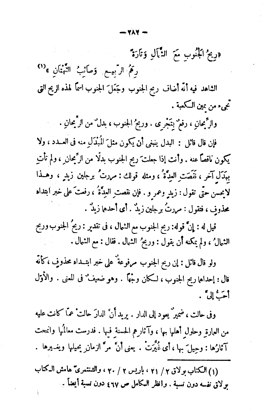 ولو قال قائل: إن (ريح الجَنوب) مرفوعة على خبر ابتداء محذوف - كأنه قال: إحداهما ريح الجنوب - لكان وجهاً، وهوضعيف في المعنى، والأول أحب إليّ. وفي (حالت) ضمير يعود إلى الدار، يريد أن الدار حالت عما كانت عليه - من العمارة، وحلولِ أهلها بها، وآثارهم الحسنة فيها - فدرست معالُمها وانمحت آثارها.