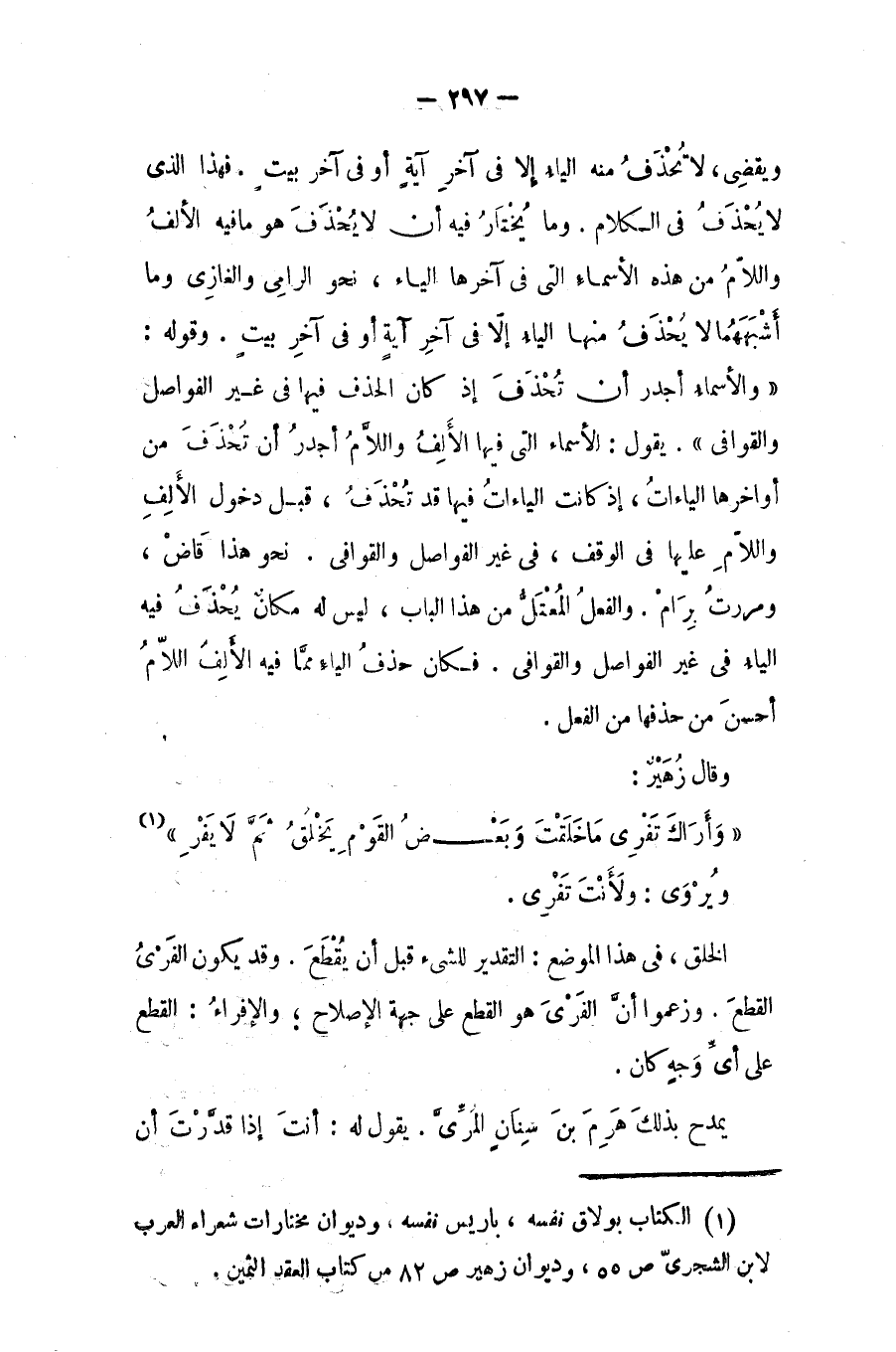 ويقضي) لا تحذف منه الياء إلا في آخر آية أو في آخر بيت، فهذا الذي لا يحذف في الكلام. وما يُختار فيه أن لا يحذف هو ما فيه الألف واللام من هذه الأسماء التي في أواخرها الياء نحو (الرامي والغازي) وما أشبههما، لا تحذف منها الياء إلا في