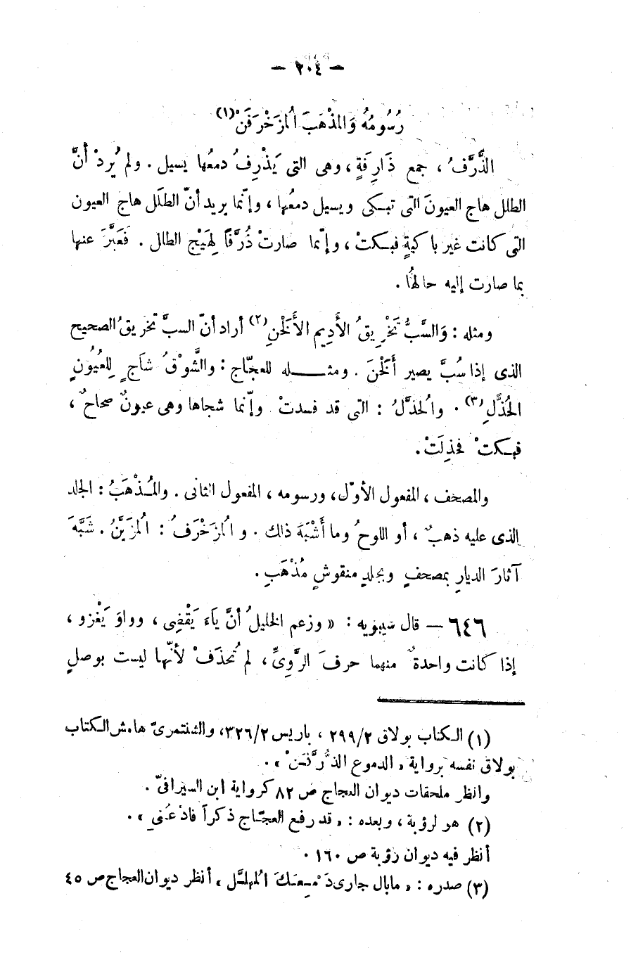 الحُذَّلِ: التي قد فسدت، وإنما شجاها وهي عيون صِحاح، فبكت فحَذلَت. و (المصحف) المفعول الأول، و (رسومته) المفعول الثاني، والمذهب: الجلد الذي عليه ذهب، أو اللوح أو ما أشبه ذلك، والمزخرف: المزين. شبه آثار الديار بمصحف وبجلد منقوش مذهب.