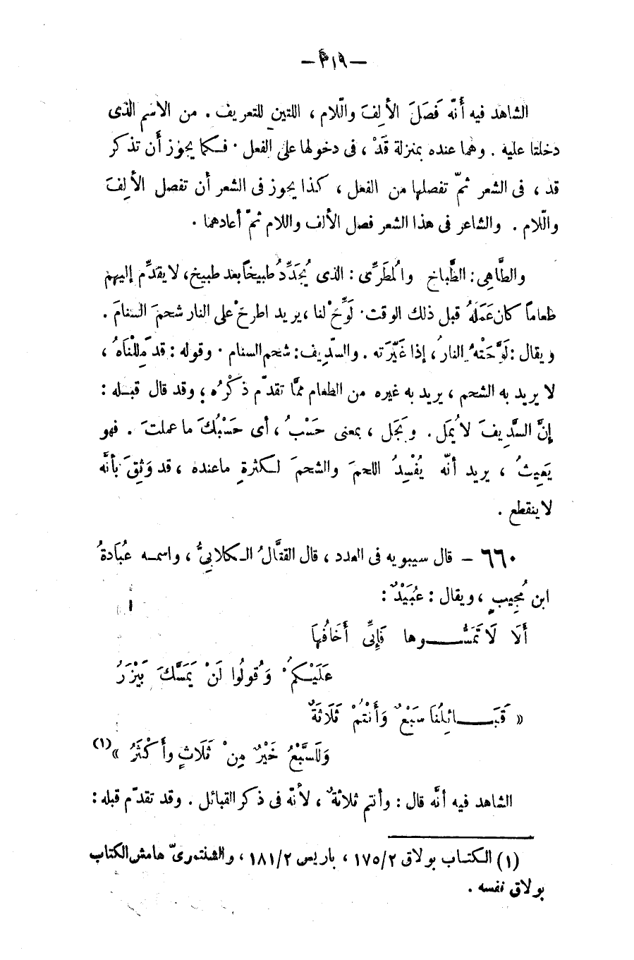 الشاهد فيه أنه فصل الألف واللام اللتين للتعريف من الاسم الذي دخلَتا عليه، وهما عنده بمنزلة (قد) في دخولها على الفعل، فكما يجوز أن تذكر (قد) في الشعر ثم تفصلها من الفعل، كذا يجوز في الشعر أن تفصل الألف واللام. والشاعر في هذا الشعر فصل الألف واللام ثم أعادهما.