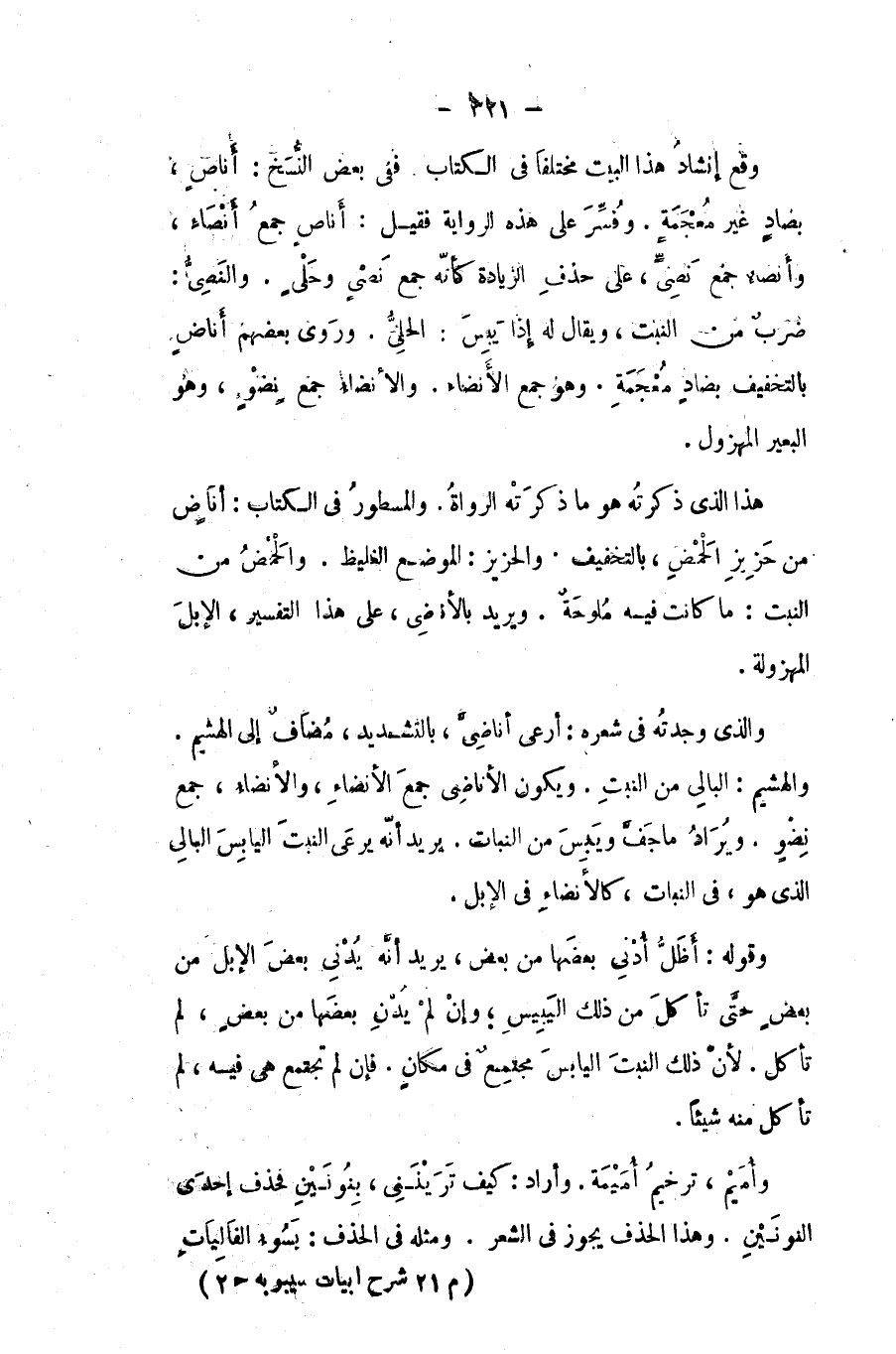 وقع إنشاد هذا البيت مختلفاً في الكتاب، ففي بعض النسخ (أناصٍ) بصاد غير معجمة، وفسِّر على هذه الرواية فقيل: أناصٍ: جمع أنصاء، وأنصاء جمع نَصِي على حذف الزيادة، كأنه جمع نصْي وحَلْي. والنَصِي: ضرب من النبت، ويقال له