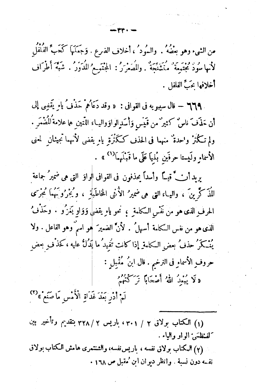 قال سيبويه في القوافي: (وقد دعاهم حذف ياء (يقضي) إلى أن حذف ناس كثير من قيس وأسد الياء والواو اللتين هما علامة المضمر، ولم تكثر واحدة منهما في الحذف ككثرة ياء (يقضي) لأنهما تجيئان لمعنى الأسماء، وليستا حرفين بنيا على ما قبلهما).
