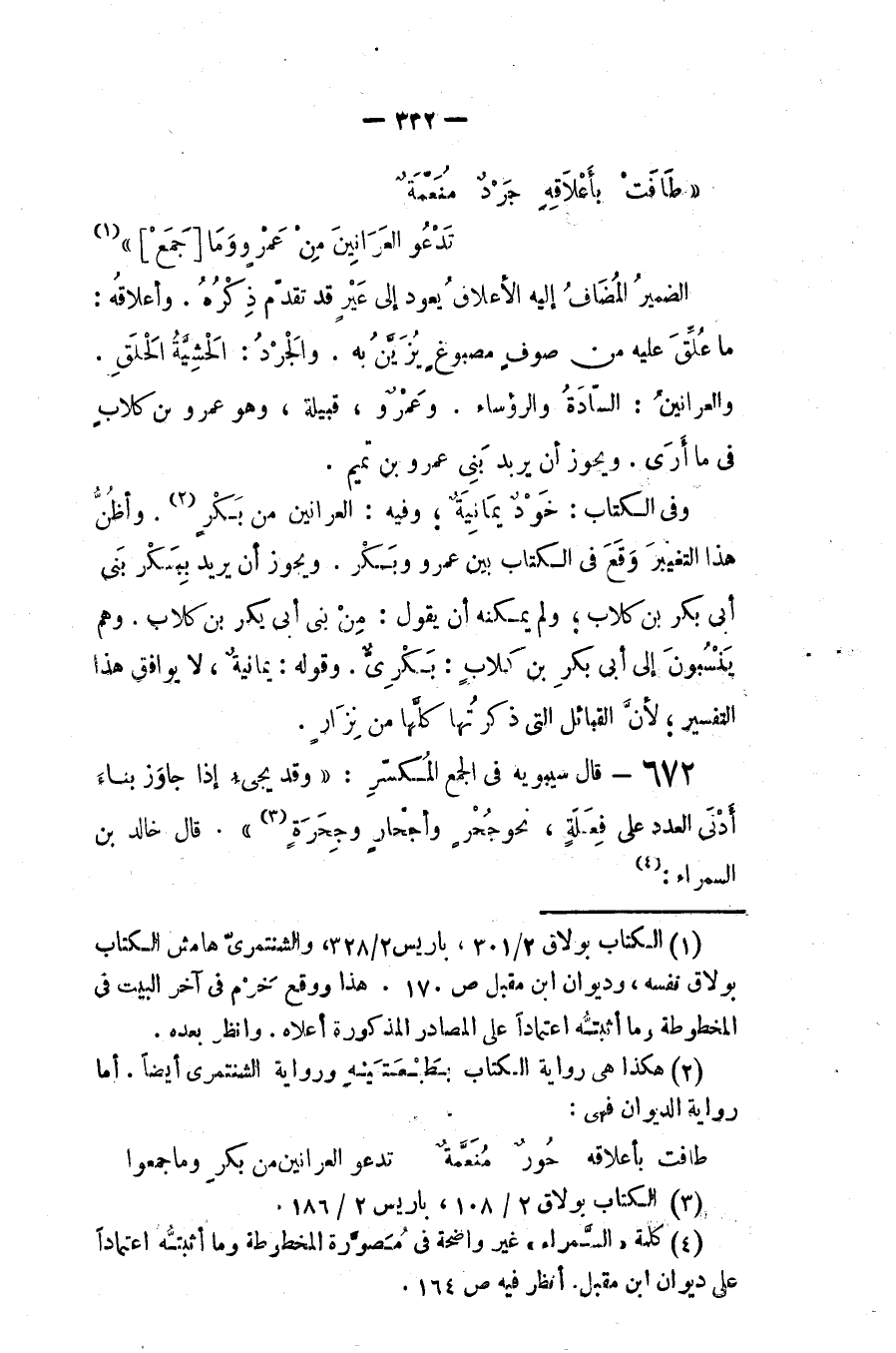 وفي الكتاب (خَود يمانية) وفيه (العرانين من بكر) وأظن هذا التغيير وقع في الكتاب بين عمرو وبكر. ويجوز أن يريد (ببكر) بني أبي بكر بن كلاب، ولم يمكنه أن يقول: من بني أبي بكر من كلاب، وهم ينسبون إلى بني أبي بكر من كلاب: بكريّ. وقوله (يمانية) لا يوافق هذا التفسير لأن القبائل التي ذكرتها كلها من نزار.