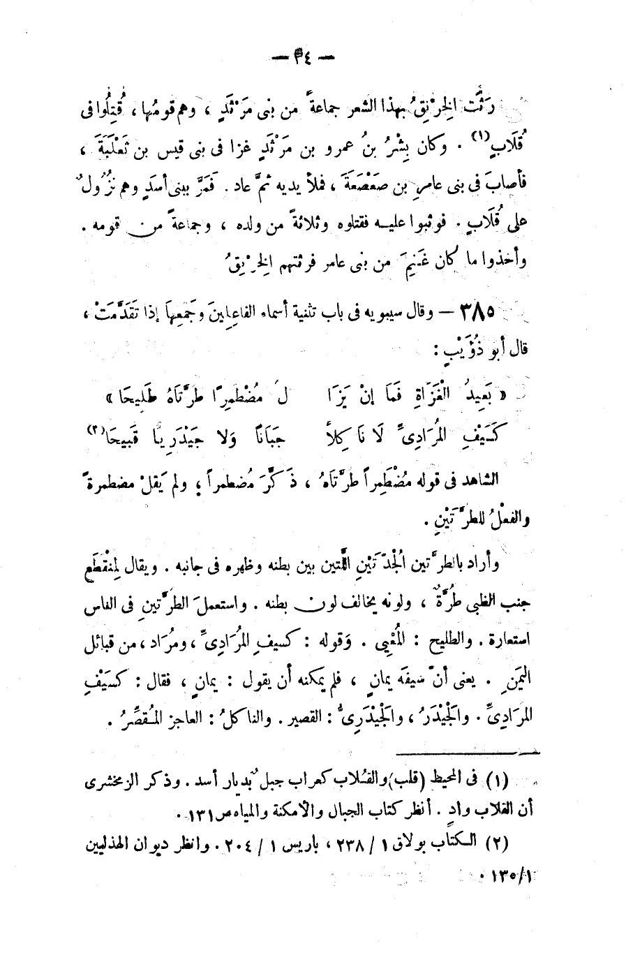 وأراد بالطرتين الجدتين اللتين بين بطنه وظهره في جانبيه، ويقال لمنقطع جنب الظبي طرة، ولونه يخالف لون بطنه، واستعمل الطرتين في الناس استعارة، والطليح: المعيي. وقوله: كسيف المرادي، ومراد من قبائل اليمن، يعني أن سيفه يماني، فلم يمكنه أن يقول: يمان فقال: كسيف المرادي. والجيدرْ والجيدري: القصير، والناكل: العاجز المقصر.
