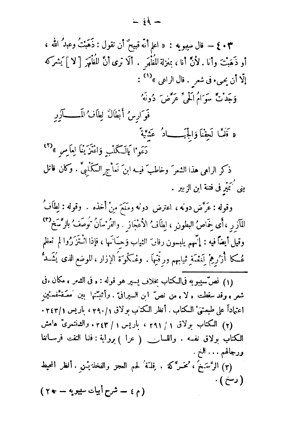 ذكر الراعي هذا الشعرْ وخاطب فيه ابنَ نعاج الكلبي، وكان قاتَلَ بني نمير في فتنة ابن الزبير. وقوله: عرّض دونه: اعترض دونَهْ ومنع من أخذه. وقوله: لطافُ المآزِرِ أي خماص البطون لطاف الأعجاز، والفرسان توصف بالرَّسَح وقيل أيضاً فيه: إنهم يلبسون رقاق الثيابْ وحسانها، فإذا ائتزروا لم تعظم عكا