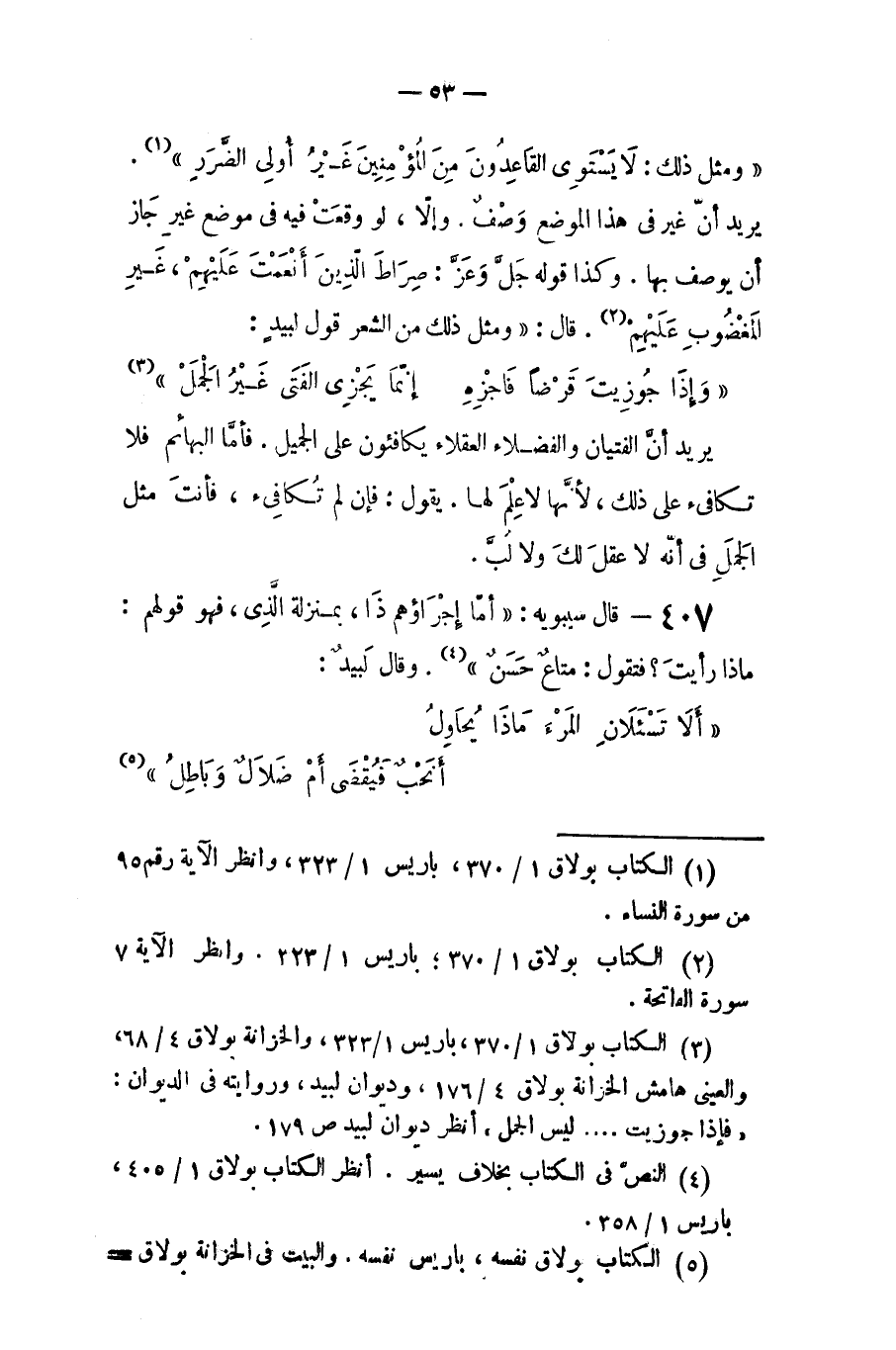 (ومثل ذلك: (لا يستوي القاعدون من المؤمنين غير أولي الضرر) يريد أن (غير) في هذا الموضع وصف، و (إلا) لو وقعت فيه في موضع (غير) جاز أن يوصف بها. وكذا قوله جلْ وعز (صراط الذين أنعمت عليهم غير المغضوب عليهم)، قال: (ومثل ذلك في الشعر قول لبيد: