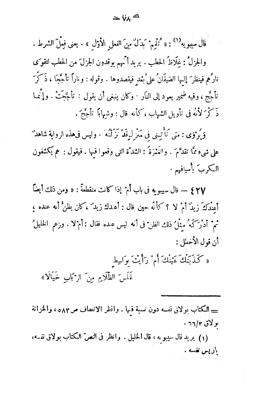 (ومن ذلك أيضاً، أعندك زيد أم لا؟ كأنه حين قال: أعندك زيد، كان يظن أنه عنده، ثم أدركه مثل ذلك الظن في أنه ليس عنده فقال: أم لا. فزعم الخليل أنّ قول الأخطل: